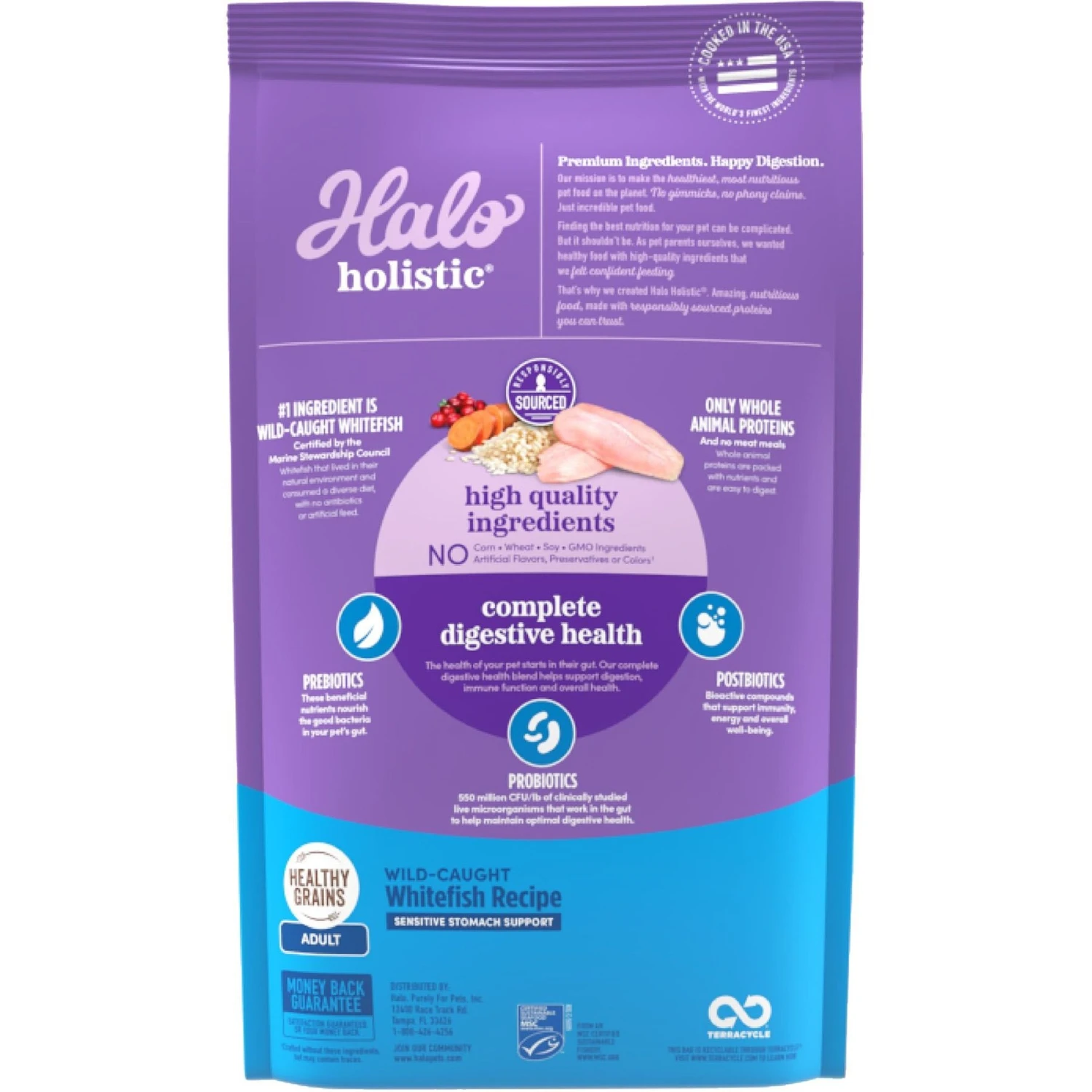 Halo Holistic Seafood Medley Sensitive Stomach Dry Cat Food, 6-lb bag — Feed your kitty a tummy-friendly meal with Halo Holistic Sensitive Stomach Seafood Medley Adult Dry Cat Food. This highly digestible, ultra-premium dry cat food is brimming with real fish taste, thanks to whole, certified wild-caught whitefish as the first ingredient. Added vitamins, minerals and nutrients help this natural formula provide complete and wholesome nutrition for adult cats, with extra support for skin and coat health. The holistic recipe is also made with prebiotics and probiotics to support every stage of digestion. Your cat will love the taste of this food that’s made for sensitive stomachs!