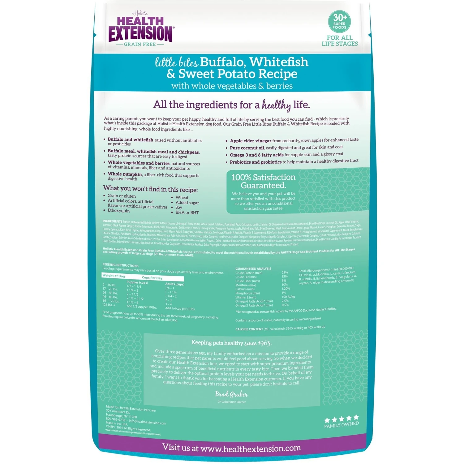 Health Extension Grain Free Little Bites Buffalo & Whitefish Recipe Dry Dog Food is specially made to support the health and well-being of your teacup, toy or miniature dog or puppy. It offers a completely balanced diet with highly digestible meat proteins, and contains a unique blend of nutrients and supplements—like organic apple cider vinegar and colostrum to boost immune systems—providing your dog the benefits of a healthier life. And you won’t find any added hormones. Just high-quality, buffalo and deboned whitefish as the first ingredients. There are absolutely no by-products, rendered animal fats, corn, gluten, wheat, soy or artificial flavors, colors, dyes or preservatives. With such a pure formula, it’s especially beneficial for dogs with allergies to poultry or with sensitive digestive tracts.