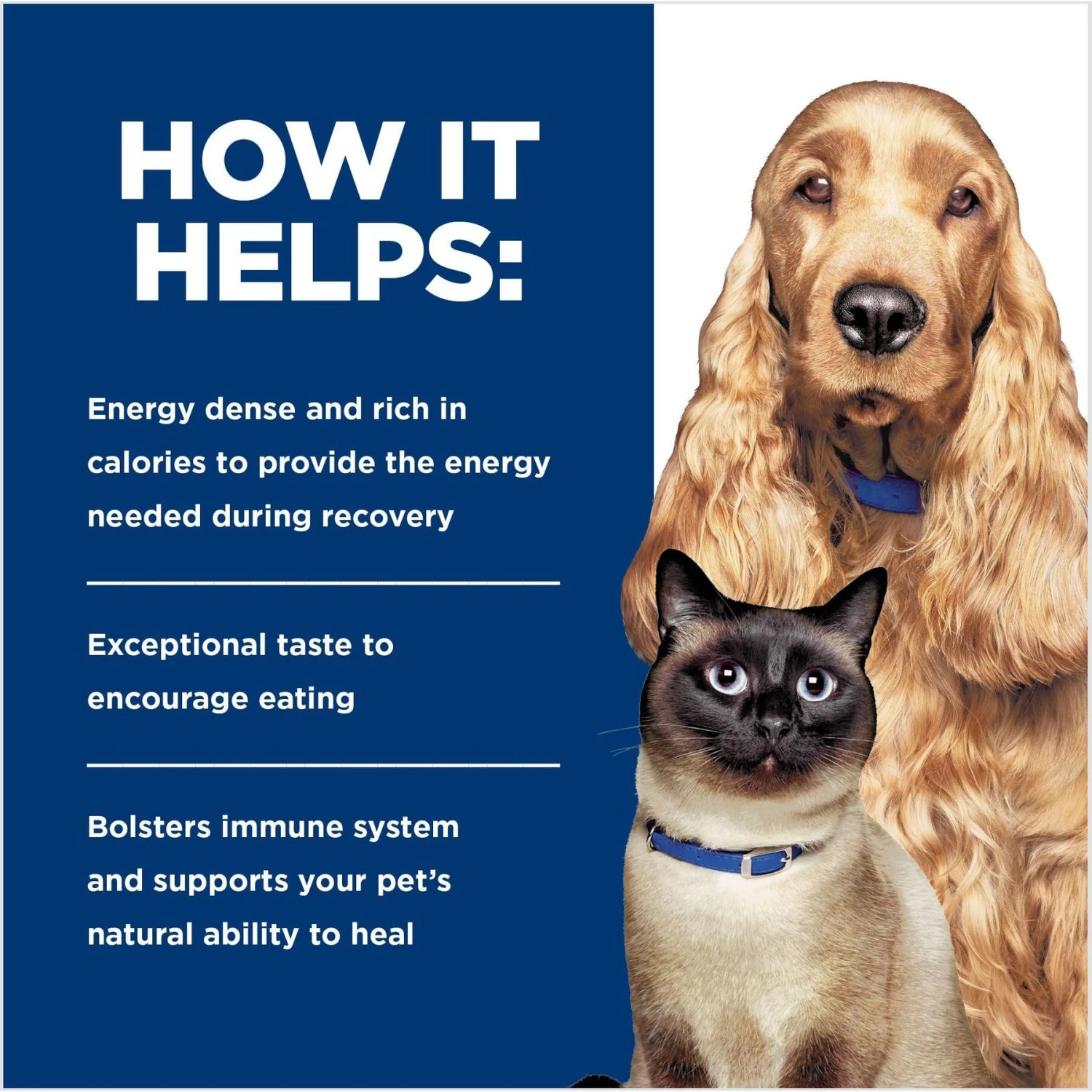 Cats and dogs can undergo significant metabolic changes when recovering from a serious illness, injury or surgery. During these stressful conditions the body is challenged to maintain strong natural defenses and spare lean body mass, which makes it is even more important to feed the right food. Cats and dogs need extra energy and nutrients, in an appetizing form, to encourage the recovery process. At Hill’s, nutritionists and veterinarians developed clinical nutrition especially formulated to help dogs and cats in recovering process.