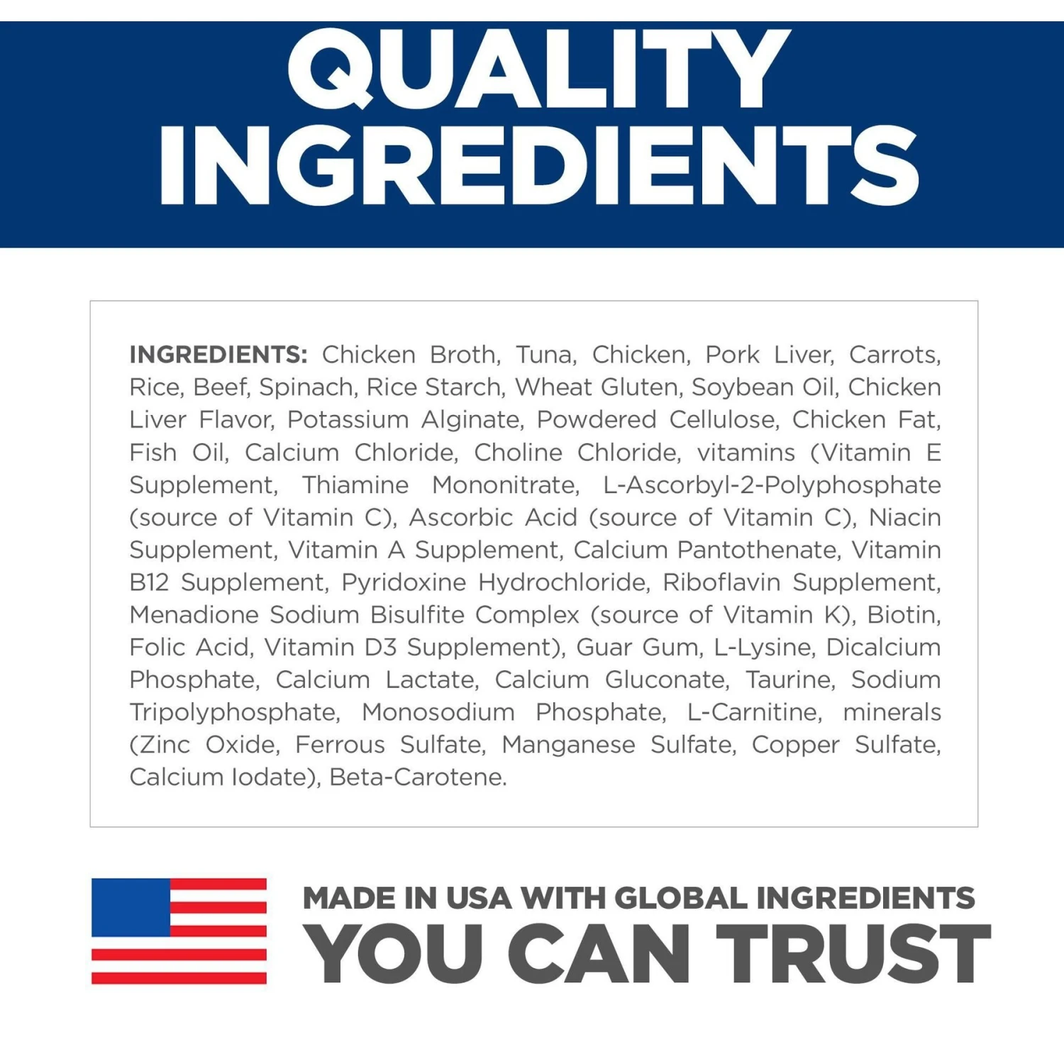 What you feed your pet matters, especially during her senior years. That’s why Hill’s has great-tasting, nutritious food to help your mature cat thrive as she continues to age. Hill’s Science Diet Adult 11+ Healthy Cuisine Seared Tuna & Carrot Medley Canned Cat Food combines the delicious flavors of seared tuna and tender carrots in a mouthwatering sauce. Free of artificial flavors and preservatives, this wholesome recipe provides your mature cat with the perfect balance of taste and nutrition.