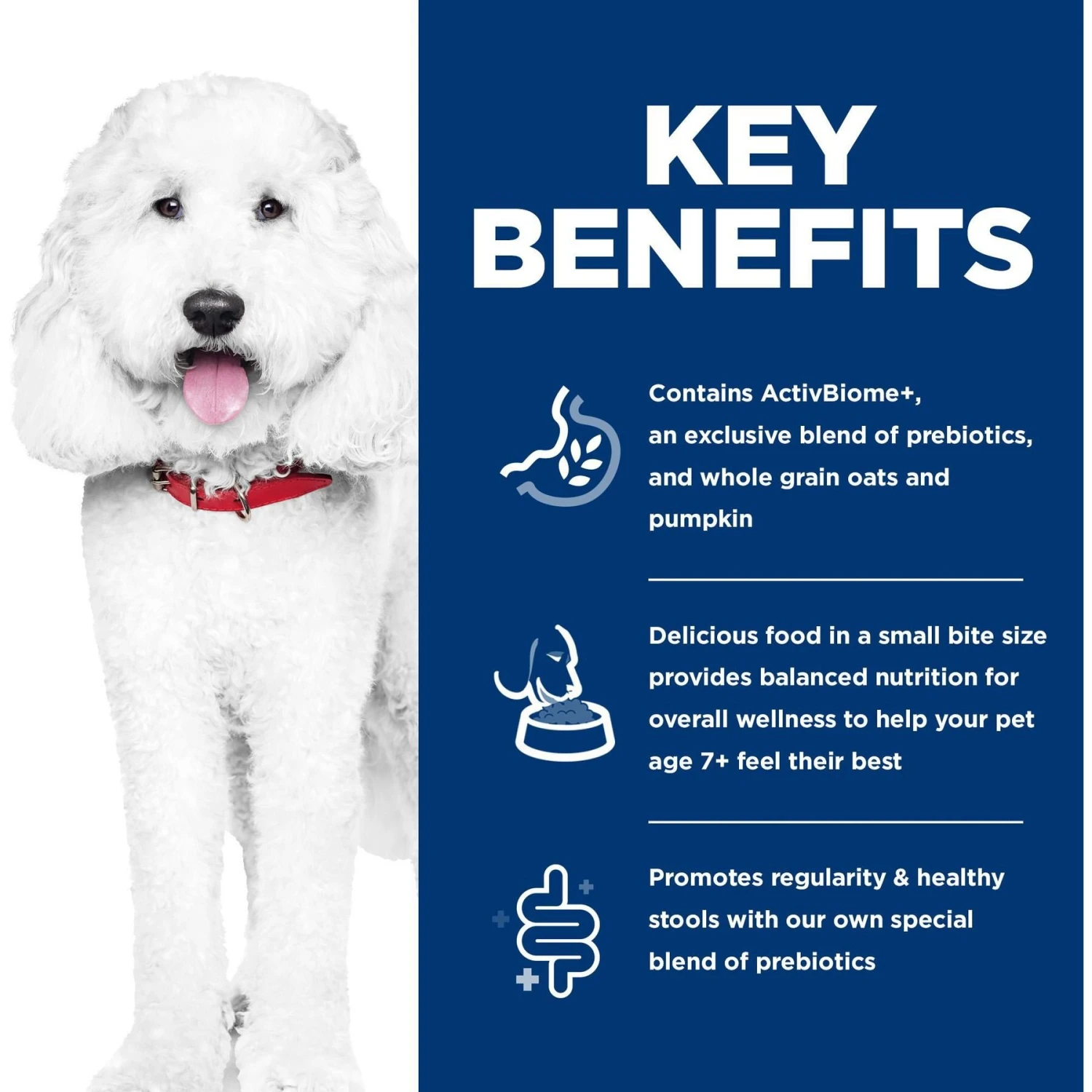 Potty problems will be a thing of the past with Hill’s Science Diet Adult 7+ Perfect Digestion Small Bites Chicken, Dry Dog Food. Formulated with real, yummy chicken, their exclusive ActivBiome+ Technology blend of prebiotics, whole grain oats, and pumpkin, this small-bite kibble is packed with nutrients that support digestive well-being—this means regular, healthy stools! In as little as seven days, you can simply and easily begin to support your older pooch’s gut microbiome for an overall happier pet.