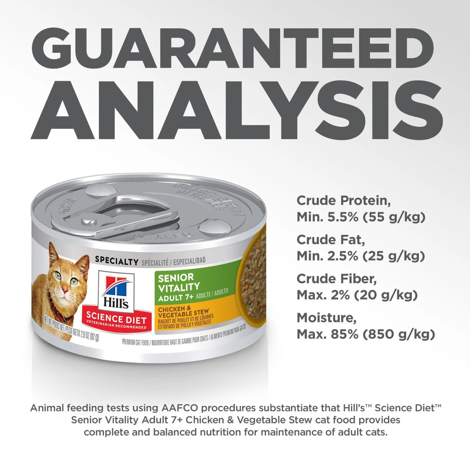 Help keep your cat feeling and acting young with the Hill’s Science Diet Adult 7+ Senior Vitality Chicken & Vegetable Stew Canned Cat Food. Because every moment you spend with your pet is special, this delicious stew recipe is packed with all kinds of youth-preserving goodness. Including powerful antioxidants for a healthy brain, as well as nutrients that support activity and an interest in playing, it’s all made with quality ingredients that are easy to digest. Plus, it’s recommended by veterinarians so you know you’re feeding your cat the very best.