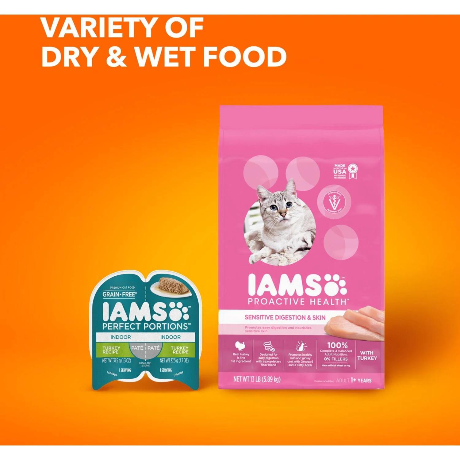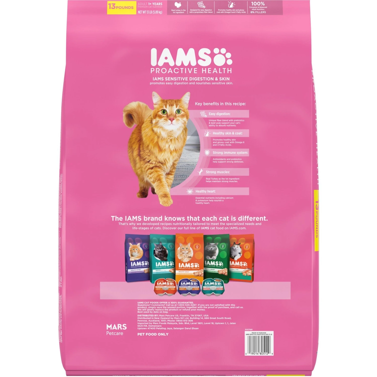 Your cat will love the purr-fectly balanced nutrition of IAMS PROACTIVE HEALTH Adult Sensitive Digestion & Skin, Dry Cat Food with Turkey. This dry food is formulated for cats with sensitive stomachs, digestion and skin to provide a little extra support. It’s made without soy or wheat, so it’s easy on the stomach and digestive system, and tasty turkey is the very first ingredient. Plus, omega-3 and omega-6 fatty acids support glowing skin and a shiny coat. A blend of prebiotics and beet pulp aid nutrient absorption and support digestive health, too!
