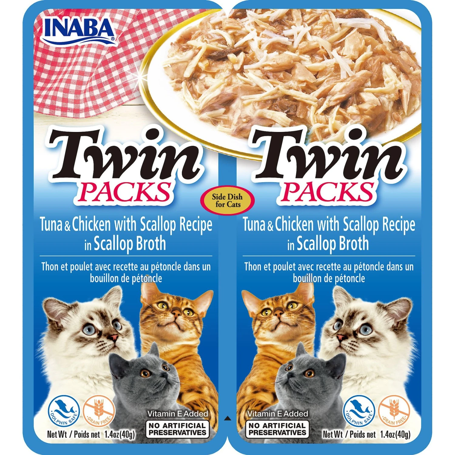 Help keep your homie happy with Inaba Twin Packs Tuna & Chicken with Scallop Recipe in Scallop Broth Grain-Free Cat Food Topper. This tasty food topper for cats is crafted with 100% natural chicken breast flakes, shredded wild tuna and scrumptious scallops in a savory scallop broth gelée. It features an enticing aroma and irresistible taste that’s low in calories and high in moisture. This cat food topper is formulated to be free from grains, corn, wheat, soy, preservatives and artificial colors using only carefully selected ingredients for maximum fur-eshness.
