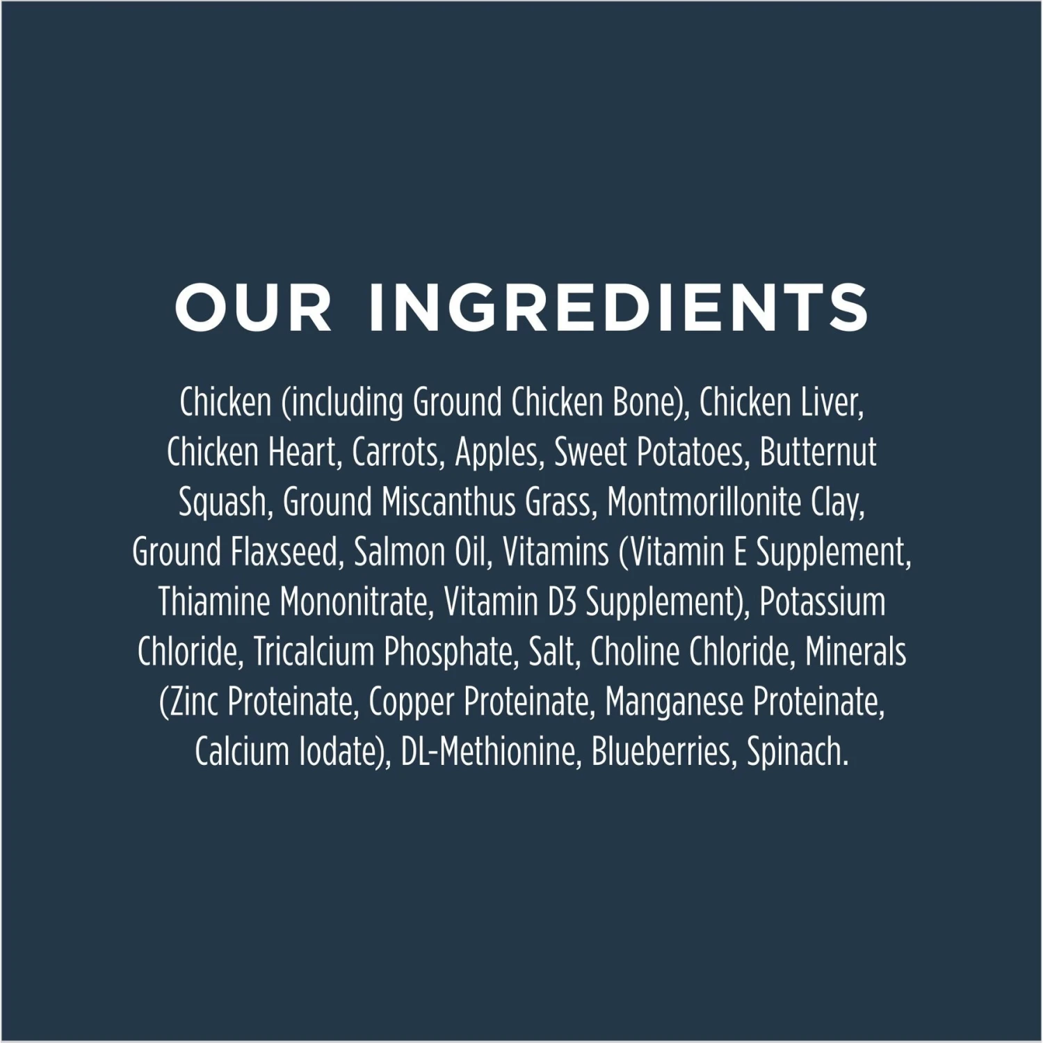 - Protein-packed recipe with cage-free chicken, non-GMO vegetables, fruits and wholesome ingredients, without any grains or fillers mother nature wouldn’t feed her dog.