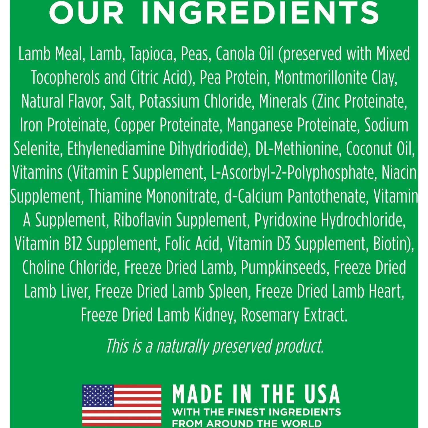 - Made with grass-fed lamb, an easily digestible protein that provides all the essential amino acids your pooch needs.