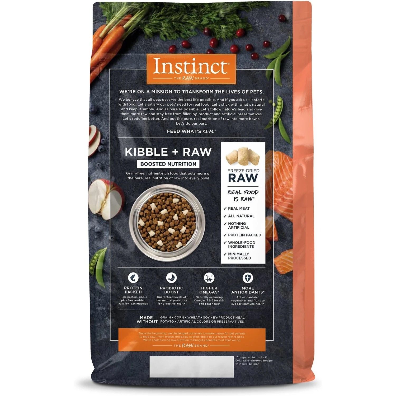 Take your dog’s dry food to the next level with Instinct Raw Boost Grain-Free Recipe with Real Salmon & Freeze-Dried Raw Pieces Dry Dog Food. This all-natural formula is made in the USA and combines high-protein kibble with bites of freeze-dried raw meat, along with other minimally processed whole-food ingredients like real salmon and antioxidant-rich fruits and veggies to support overall health. The freeze-drying process helps preserve the raw nutrients your dog needs and the delicious flavor he craves. Every bite is crafted with a boost of live, natural probiotics to support your sidekick’s digestive health and has naturally occurring omega fatty acids to encourage healthy skin and a shiny coat. Not only is this dry dog food completely free of grains, but it’s also made without corn, wheat, soy, by-product meal, potato, artificial colors or preservatives!