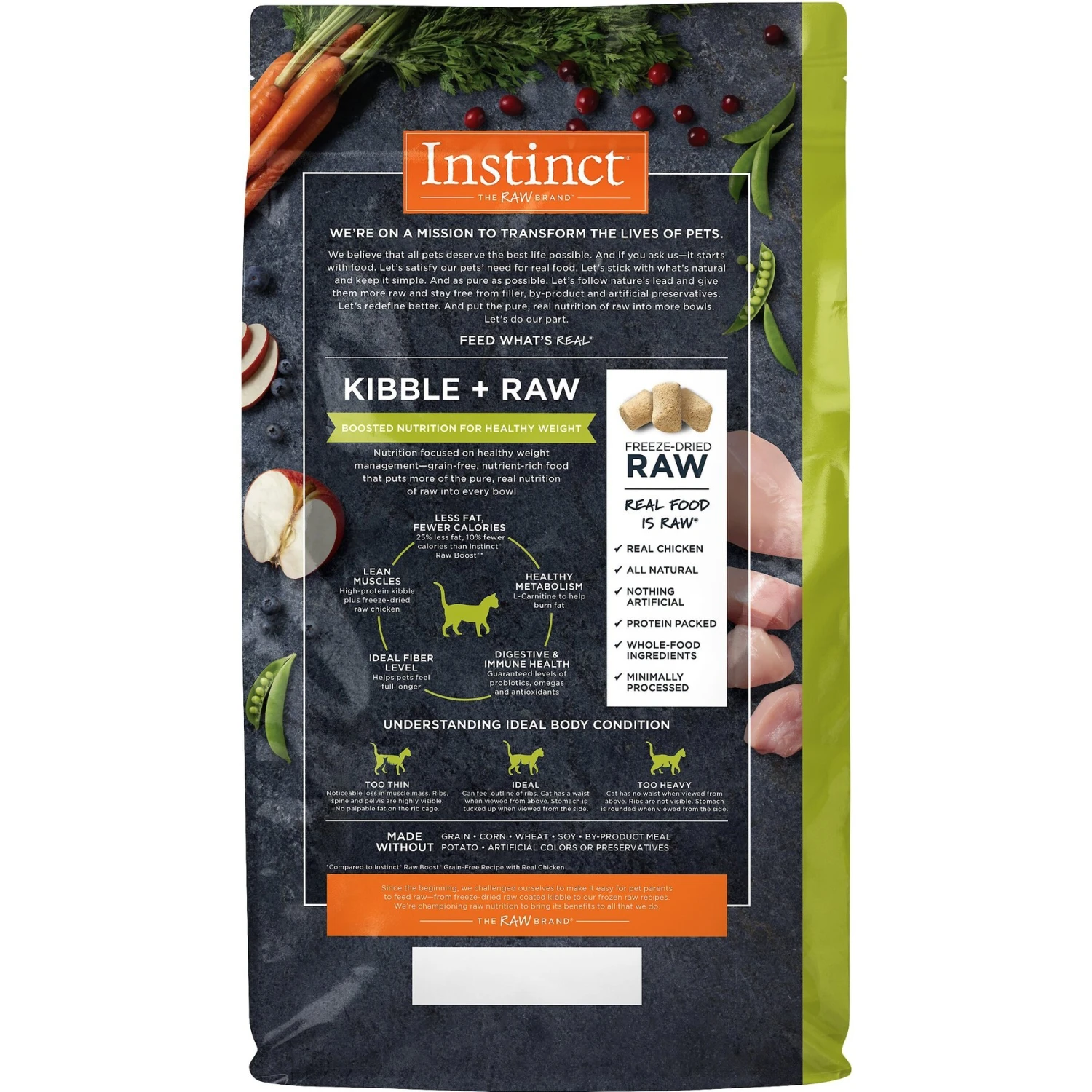 - Cage-free chicken is the first ingredient so it’s packed with animal protein for strong, lean muscles—for 25% less fat and 15% fewer calories than Instinct Raw Boost