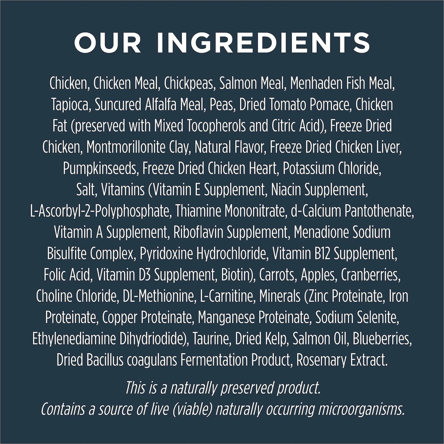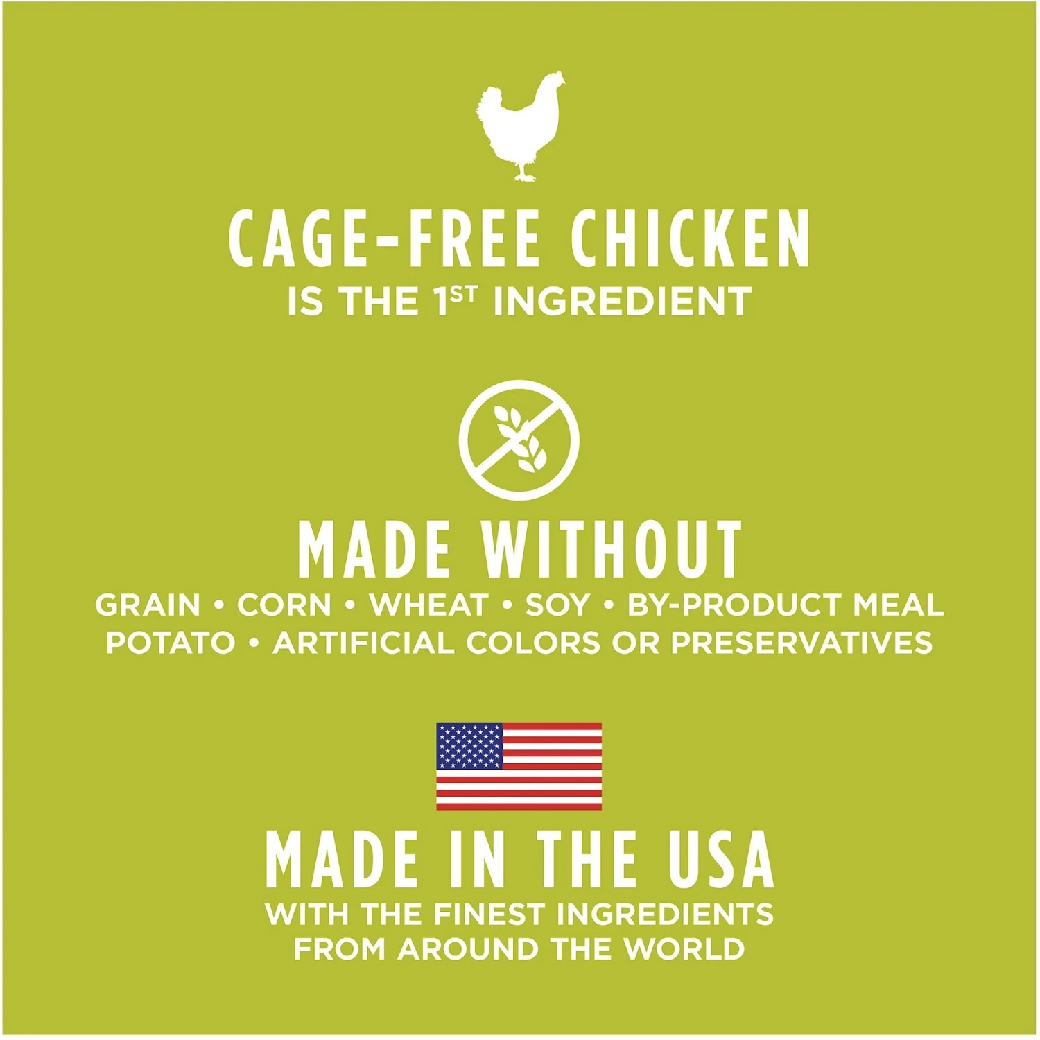 - Free from grains, potato, corn, wheat, soy, by-product meal and artificial colors and preservatives.