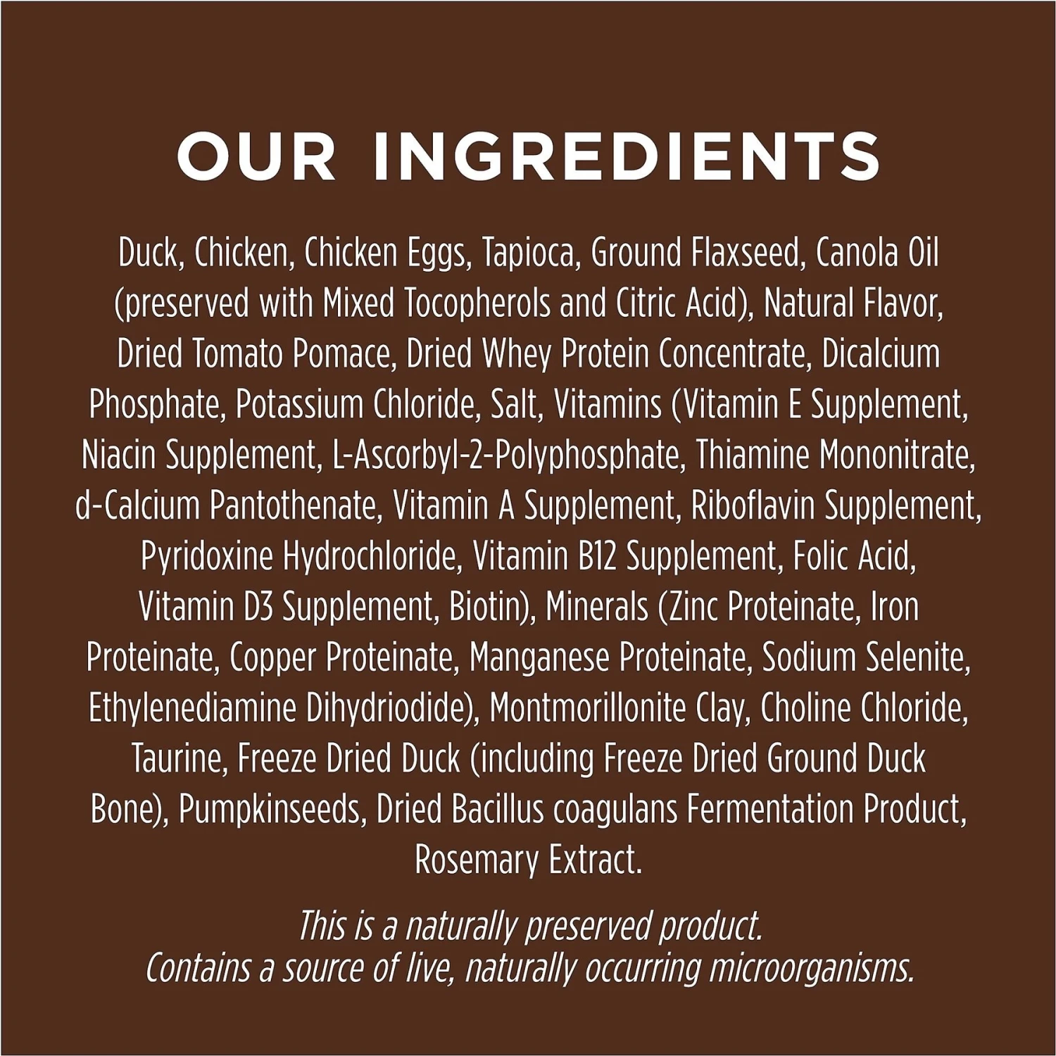 Instinct Ultimate Protein Grain-Free Cage-Free Duck Recipe Freeze-Dried Raw Coated Dry Cat Food combines the benefits of a raw diet with the convenience of kibble. 90% of the protein in this recipe comes from real duck, chicken and eggs. Live probiotics, natural omegas and antioxidants work together to support healthy digestion, a strong immune system, soft skin and a shiny coat. And best of all, this Instinct recipe is made in the USA using the world’s finest ingredients. It contains no grains, potatoes, corn, wheat, soy, by-product meals, artificial colors or preservatives.