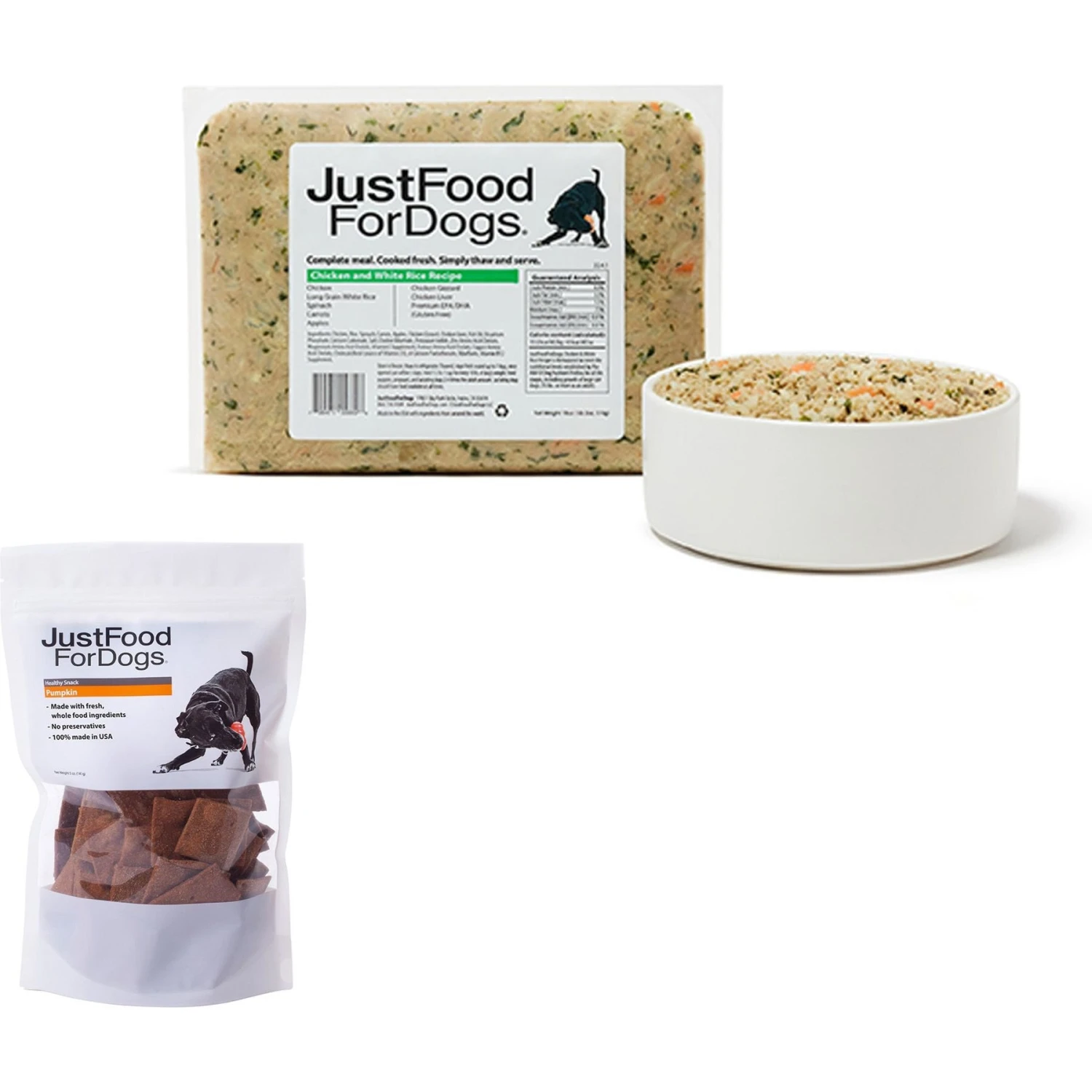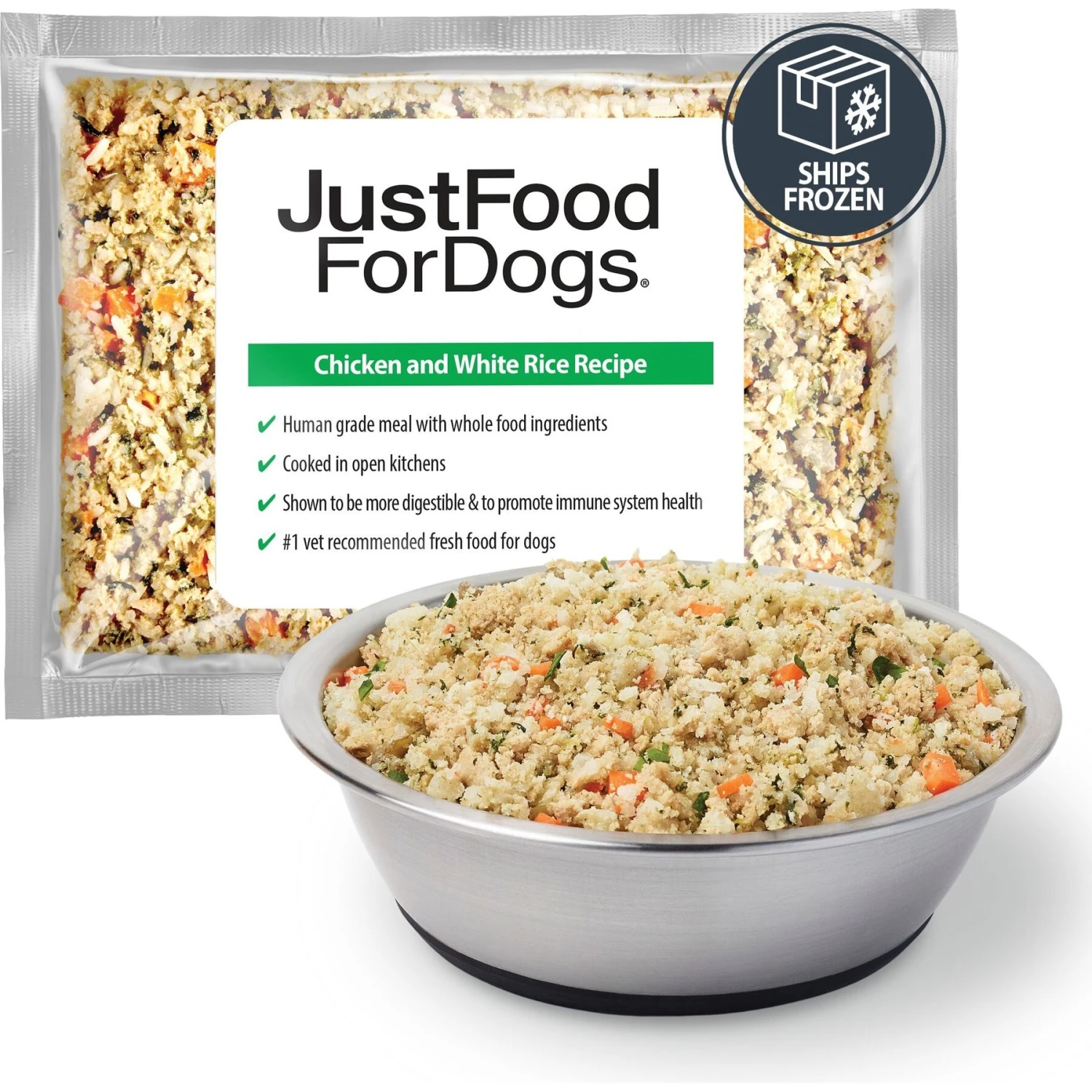 JustFoodForDogs Chicken & White Rice Recipe Frozen Human-Grade Fresh Dog Food, 18-oz pouch, case of 7—Help your pet experience the joy of a healthy life with this JustFoodForDogs Chicken & White Rice Recipe Fresh Frozen Dog Food. This dog food is crafted with real, human-grade ingredients that you can see! With chicken thighs, long-grain white rice, spinach, carrots and apples, your dog will get to experience the benefits of a whole food diet. Every batch is hand-prepared in open kitchens and lightly cooked—this ensures that each ingredient is helping to deliver the outstanding nutrition that your dog deserves. Great for puppies and adult dogs, this recipe is high in calcium and phosphorus, which help promote healthy bone and tissue growth. Along with 100% human grade ingredients, this recipe contains easy-to-digest fresh foods—helping support healthy digestion—and the JFFD Omega Plus veterinary supplement—a fish oil rich in omega fatty acids that promote skin and coat health. And since JustFoodForDogs’ meals are frozen, you can have peace of mind knowing that they are completely free from preservatives and other harmful materials. Make the change and discover the difference that a fresh, whole food diet can make in your pup’s life!