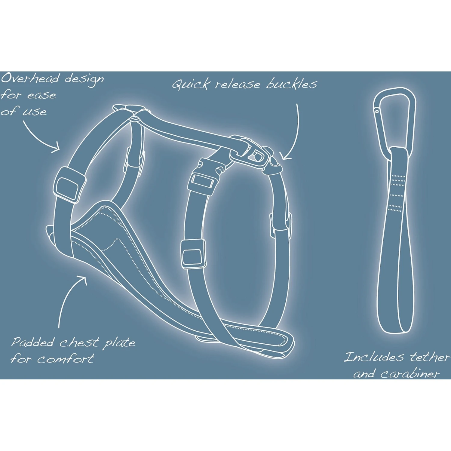 Make every outing as easy as a walk in the park with the Kurgo Tru-Fit Smart Quick Release Dog Walking Harness and Seatbelt Tether. One of Kurgo’s original harness designs, the Tru-Fit Smart Harness is a tried-and-true option made for ease and comfort. The harness slips over your dog’s head and secures with the quick-release buckles, making it easy to get and off. Five adjustment points give you a near-custom fit, and a padded chest piece reduces stress on the trachea and sternum. With two leash attachments—one on the chest and a second on the back—and a tether for securing your dog in the car, this harness has everything you need for safety and control.