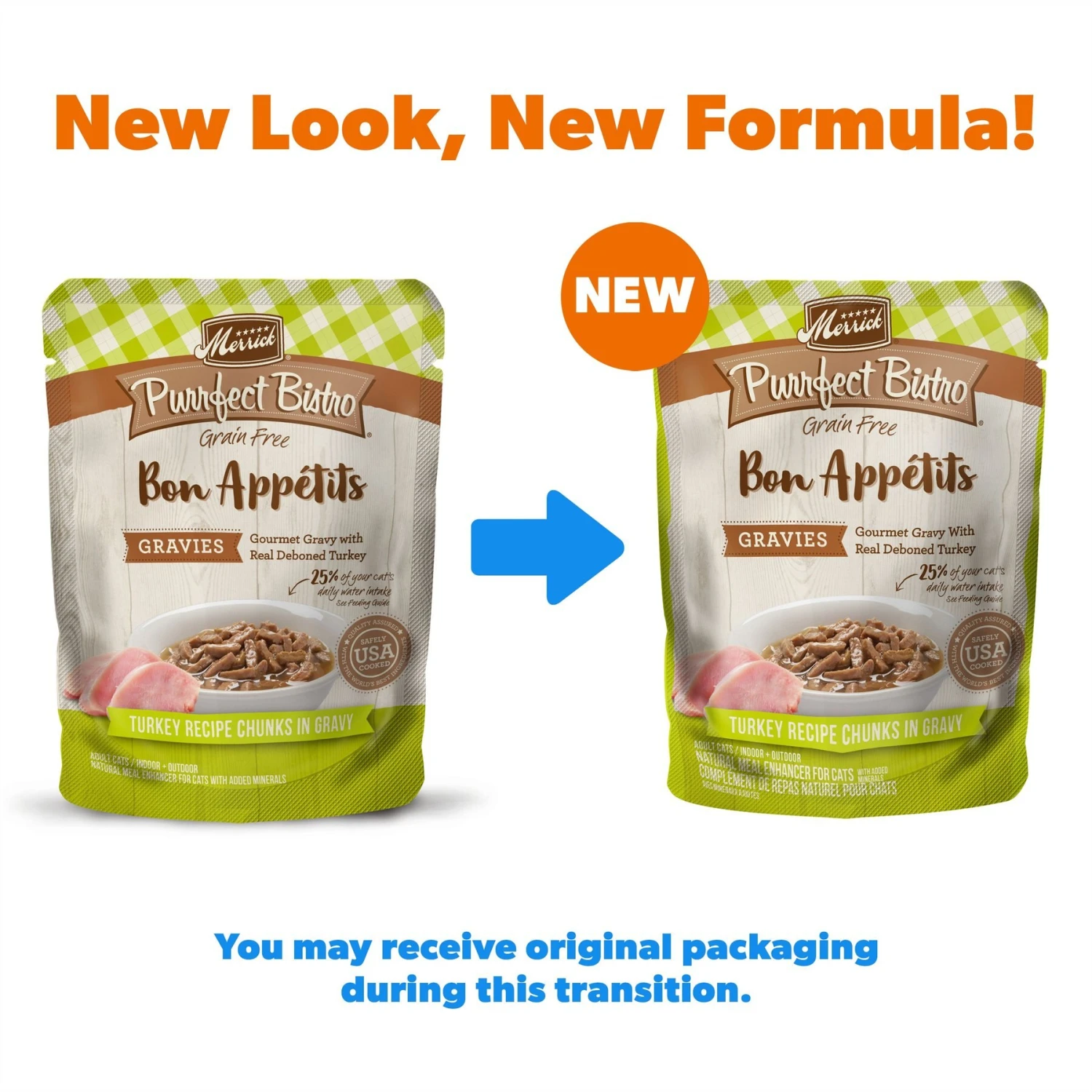 Treat your tabby to the mouthwatering taste found in Merrick’s Purrfect Bistro Bon Appetits Grain-Free Turkey Recipe Chunks in Gravy! Every purchase comes with 24 adult cat food pouches filled with a wholesome grain-free recipe featuring ingredients that are safely cooked in the USA. It’s crafted with real deboned turkey first in a lip-smacking, gourmet gravy with added minerals. The gravy not only packs a punch of flavor, but it also keeps your purring pal hydrated by providing her with 25% of her daily water intake. These pouches are the paw-fect tasty addition to your feline friend’s regular complete and balanced diet.
