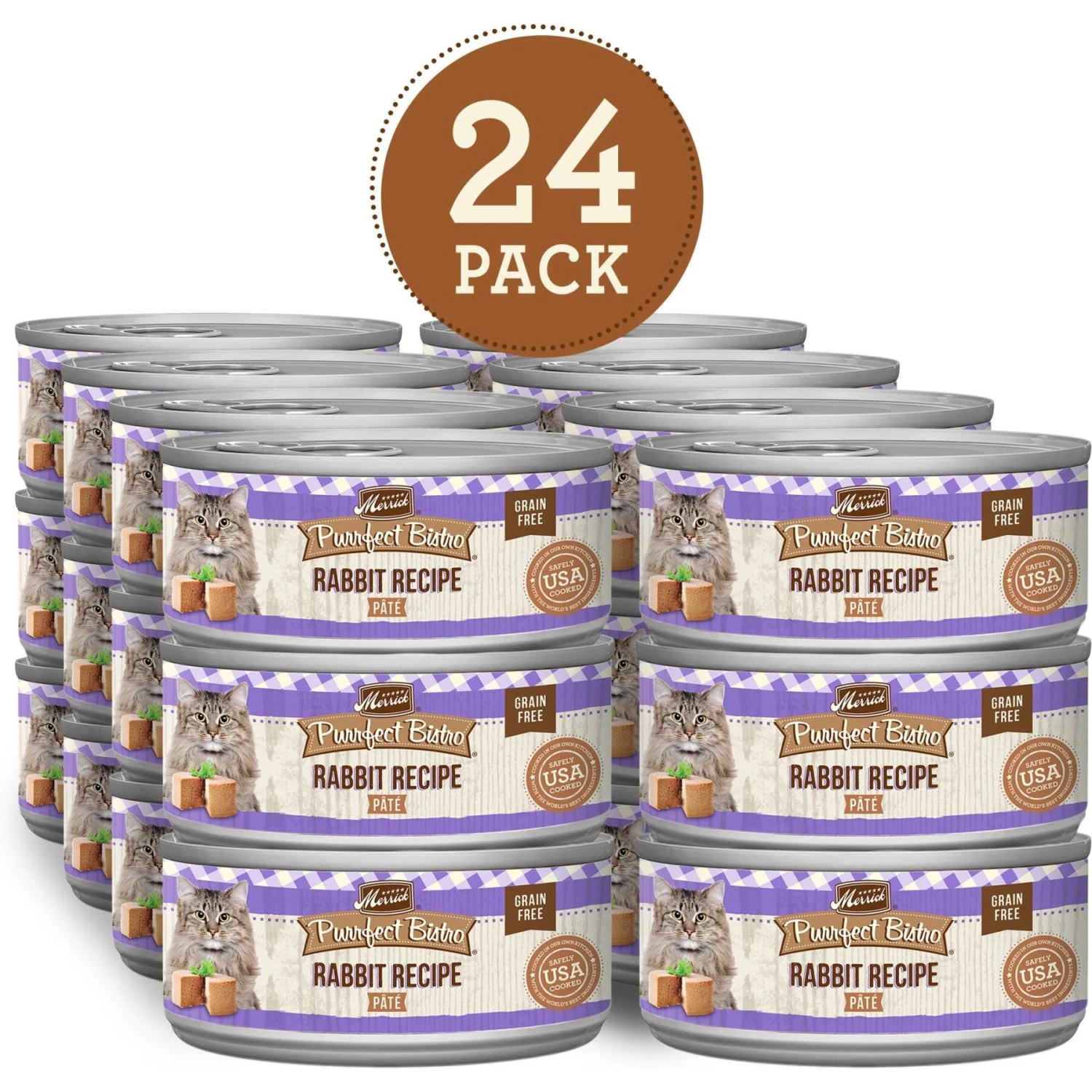 Merrick Purrfect Bistro Rabbit Pate Grain-Free Canned Cat Food is specially crafted for adult cats. This grain-free, gourmet pate is packed with the quality protein your kitty needs, featuring deboned rabbit as the very first ingredient. Other natural ingredients make up this tasty recipe—they are finely ground together, creating a smooth texture and the meaty taste cats love. Taurine, vitamins and minerals in this formula purr-vide your feline friend with the essential nutrition she needs. And you can have peace of mind knowing that this cat food is made without corn, wheat or soy and is completely free from artificial colors, flavors and preservatives. Merrick Purrfect Bistro cat pates are great for indoor and outdoor cats. And just like all Merrick cat food recipes, this one is crafted in Merrick’s Hereford, TX kitchen and cooked in the USA, in facilities that uphold strict FDA guidelines.