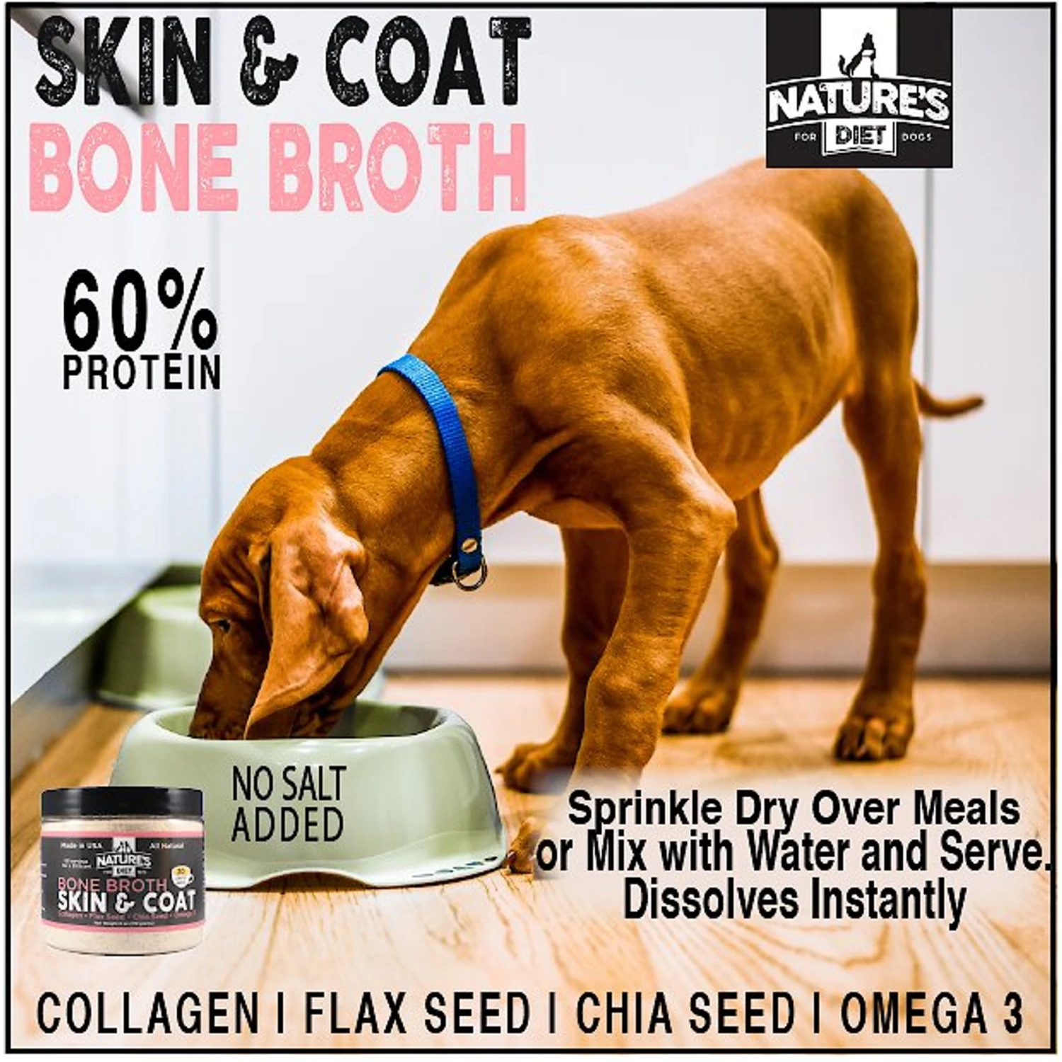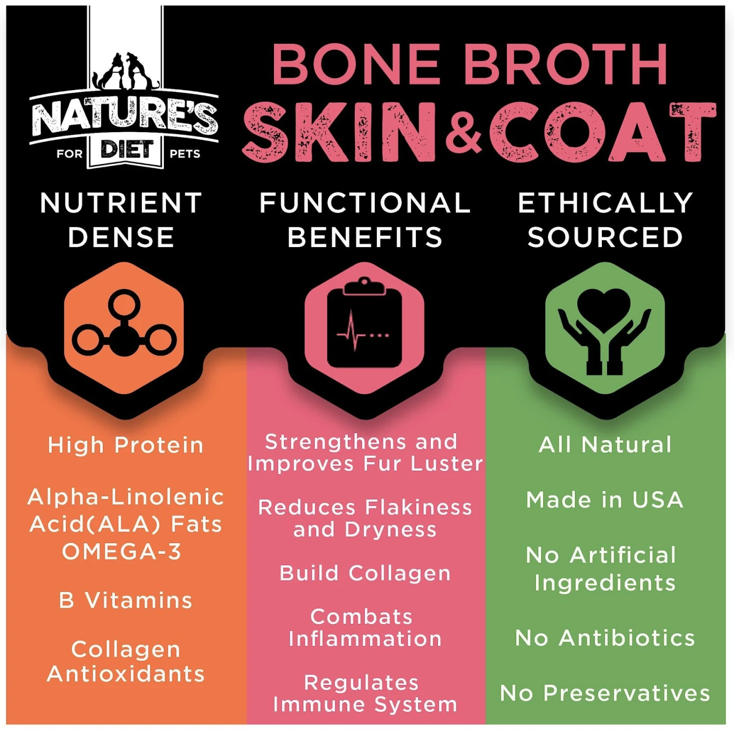 Give your furry friend the nourishment they need for a long, healthy life with the Skin & Coat Bone Broth Dry Dog & Cat Food Topping from Nature’s Diet! Specially formulated to support skin health and improve fur’s luster—this bone broth contains no added salt, preservatives or additives. All ingredients in this delectable broth are dried to a powder that can be dissolved in water and transformed into a liquid meal topper. Plus, it does not require refrigeration and is made in the USA for a taste you can trust.