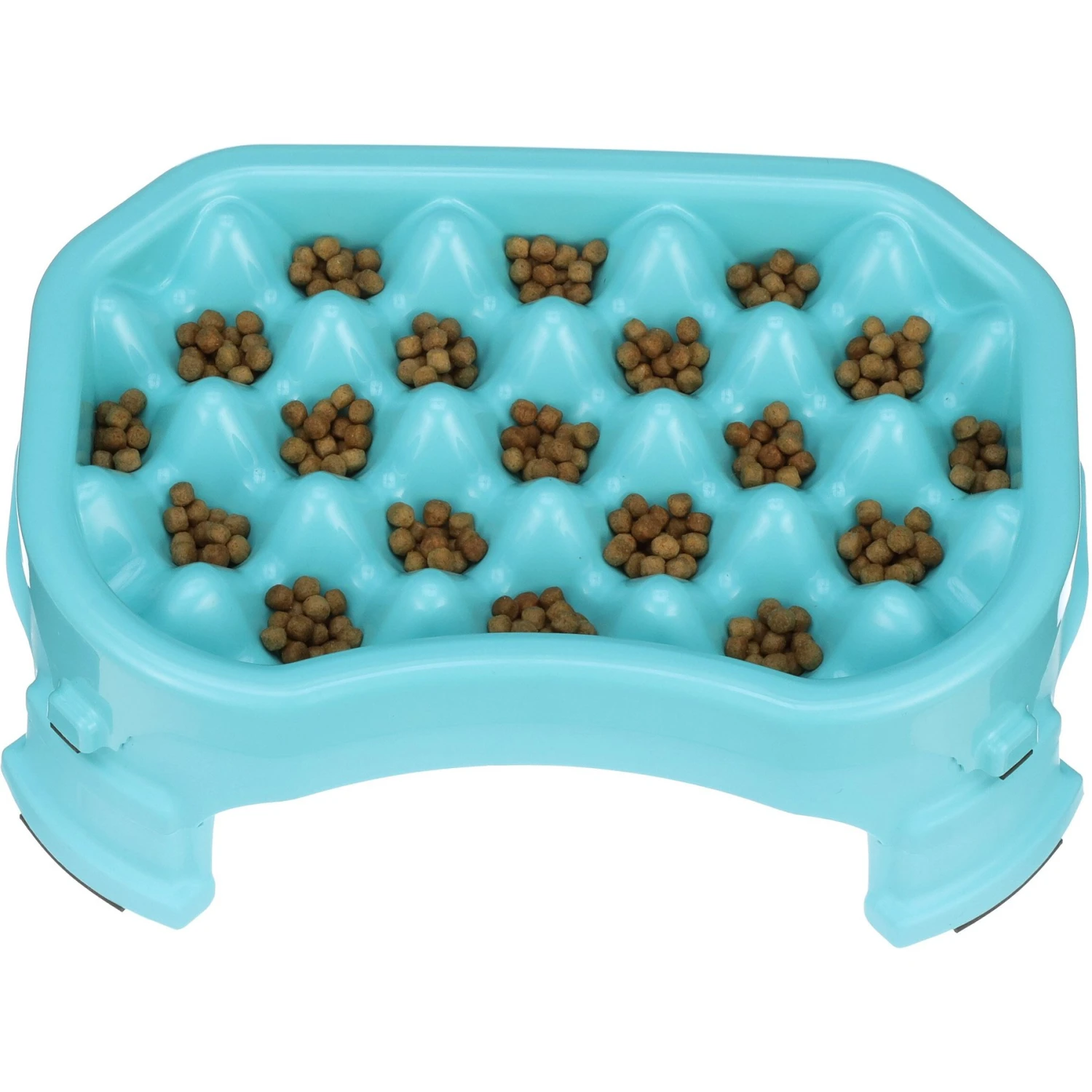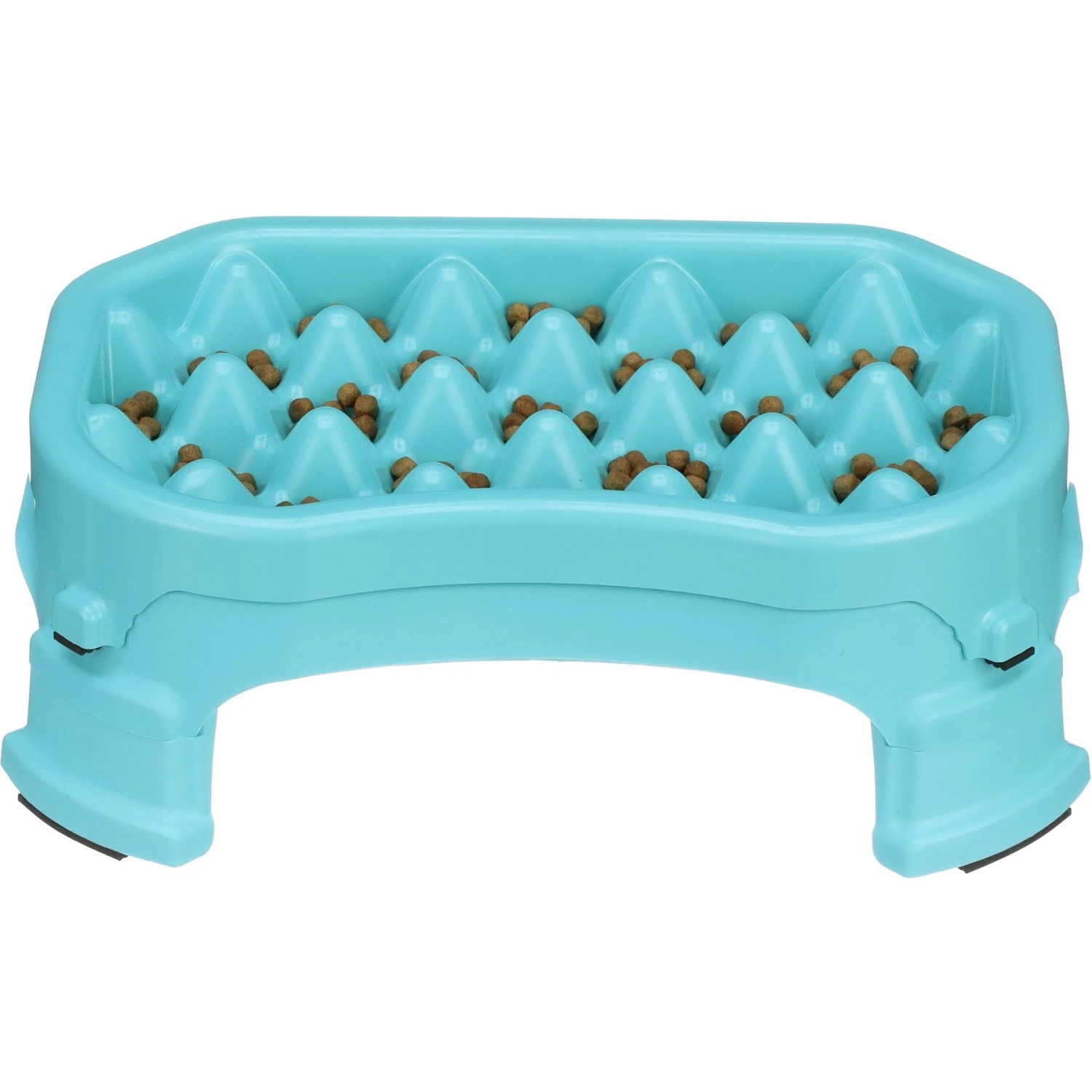 Paw-suade your furry BFF to slow down when she’s eating and serve her meal at the paw-fect height with the Neater Pets Adjustable Slow Feeder Dog & Cat Bowl. Featuring multiple peaks and valleys, your pet won’t be able to gobble up her meal, which will reduce gulping, vomiting, and bloating. Divide food amongst the various pockets to control how big of a mouthful your pet gets. The spaces are wide enough apart and rounded to comfortably accommodate noses of all shapes and sizes — even those with flat faces! Unlike other slow feed bowls, the Neater Slow Feeder lets you customize the height to three different levels to help pooches of all sizes eat from a com-fur-table position. The first level is just using the top part of the feeder by itself and this measures 2 inches high. If you want to raise the feeder up to 3 inches, then attach the base that comes with the feeder. To get the feeder to the tallest position of 4.5 inches, attach the leg extensions to the base. Having an adjustable feeder is great for puppies as it can grow with them! The Neater Slow Feeder also has non-skid rubber feet to keep it in place when your eager eater dives in. Made of food-safe polypropylene, this slow feed bowl is dishwasher safe (you may want to remove rubber feet first to make sure they don’t fall out). Stop scarf and barf today with the Neater Slow Feeder!