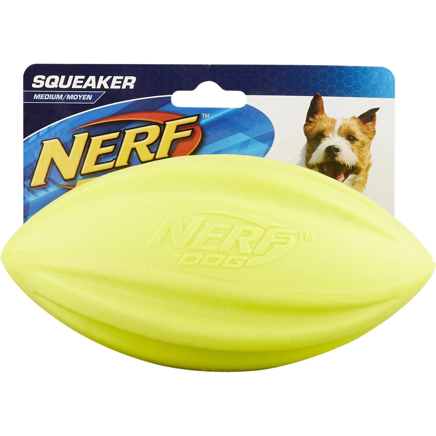 Get in the game with the interactive Nerf Dog Squeaker Football Dog Toy. You can toss it to your favorite furry friend or have him go long for the perfect catch. The spiral design is easy for both of you to grip and makes it easier to throw, even when it’s been drooled on a little. Give it a few squeezes, and you’ll have his full attention when he hears the exciting squeaking noise. With a bright neon color, it’s easy for your pup to keep his eyes on the ball as it soars through the air. The rubber exterior is strong enough for punting, kicking, retrieving and the elements—but this toy is not recommended for chewing sessions or aggressive chewers.