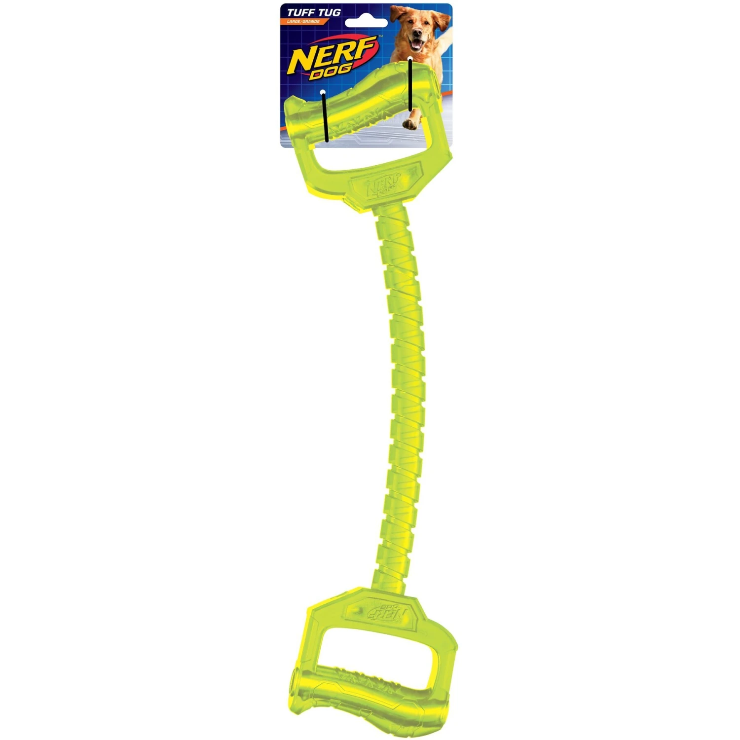 Give your energetic pal a durable toy optimized for extra-tough tugging and roughhousing with the Nerf Dog Tuff Tug 2 Handle Dog Toy. Thanks to its two handles and long reach, it’s perfect for action-packed games of tug your pal can enjoy with you, or with other friendly pups. It’s built with high-performance thermoplastic rubber that can stand up to extended rounds of fetch and tugging, so it’s the go-to toy for active pups. When it’s time to relax and store the toy, cleaning doggie drool and dirt is a cinch by just hand washing or wiping away. Plus, thanks to its waterproof design, it’s ideal for water loving pups at the beach, lake, pool, or your favorite spot!