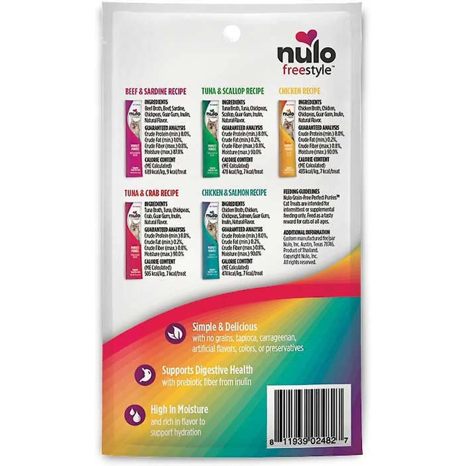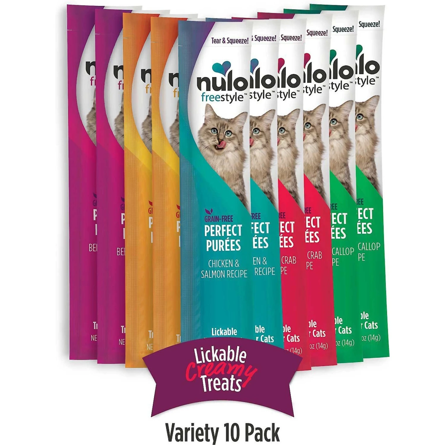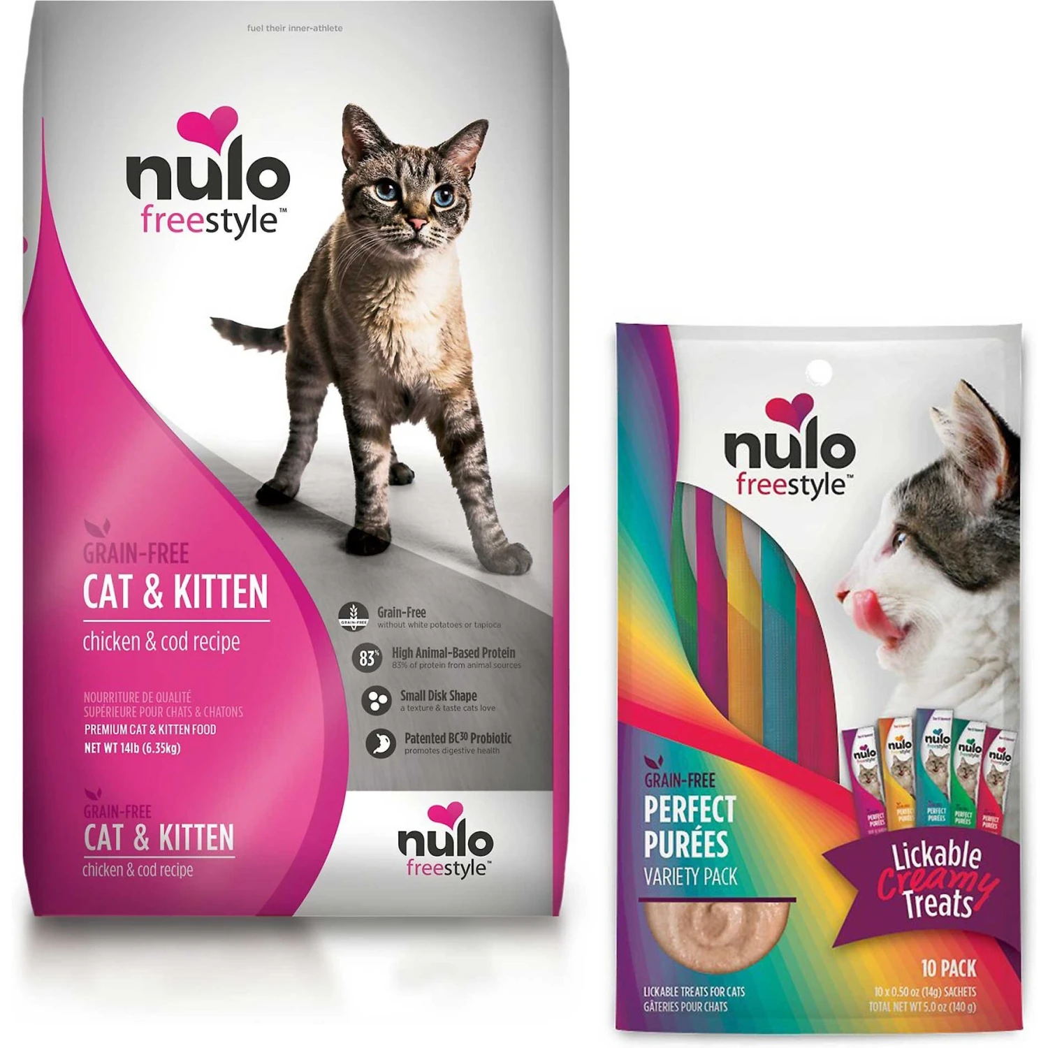 Give your kitty companion flavor that she can savor! Each purchase comes with Nulo Freestyle Chicken & Cod Recipe Grain-Free Dry Cat & Kitten Food, 14-lb bag & Nulo Freestyle Perfect Purees Variety Pack Grain-Free Lickable Cat Treats, 0.5-oz, case of 10. Nulo Freestyle Chicken & Cod Recipe Grain-Free Dry Cat & Kitten Food is formulated with 83% animal-based proteins and low glycemic index ingredients, making it perfect for growing kittens to adult cats. Nulo Freestyle Perfect Purees Variety Pack Grain-Free Lickable Cat Treats are great as a standalone reward or to add an extra dose of deliciousness and nutrition to your feline friend’s dinner. Each grain-free recipe is packed with tasty flavors and nothing else¬––no tapioca, carrageenan, artificial colors, flavors or preservatives here! They’re also high in moisture to support hydration and are made with prebiotic fiber from inulin to support digestive health. A great, low-calorie option for cats of all ages!
