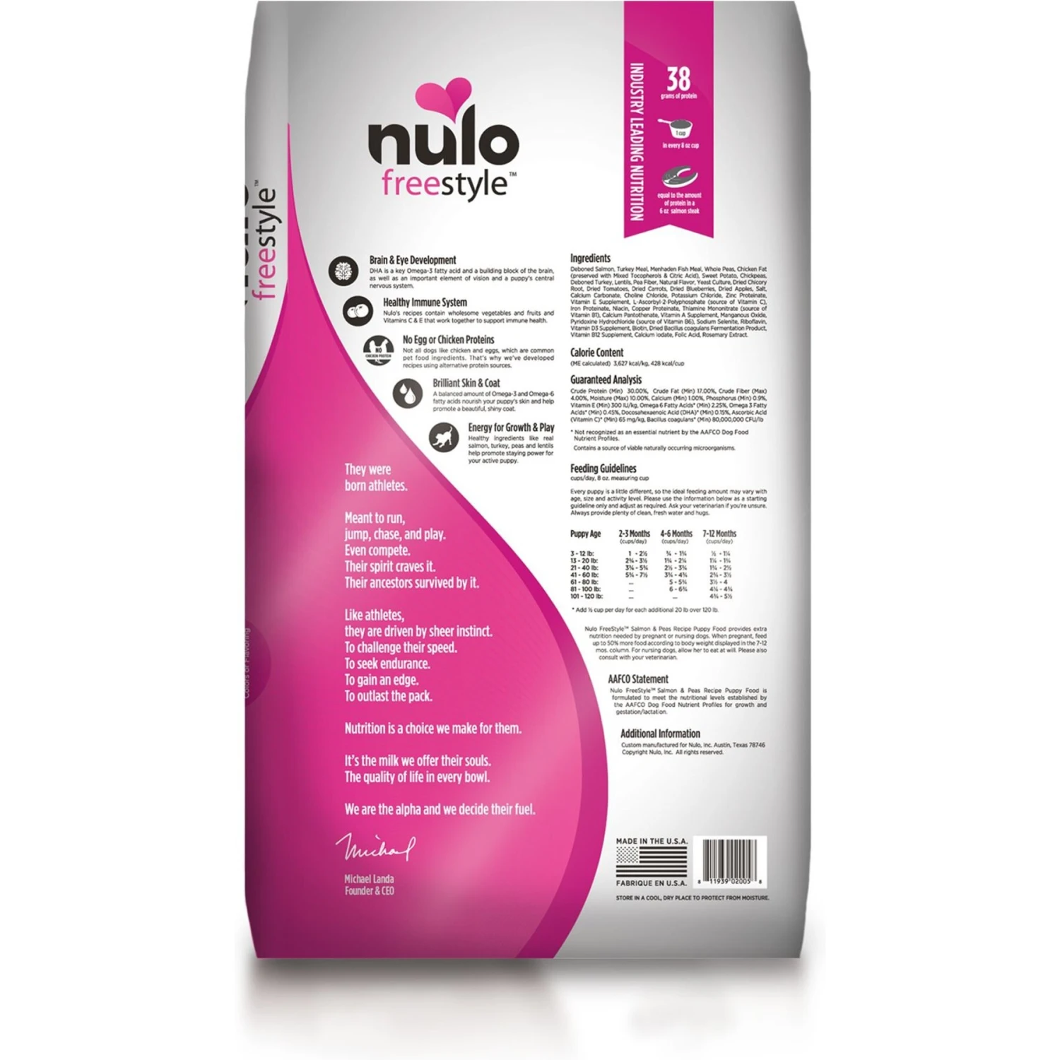 Nulo FreeStyle gives every puppy the healthy start they deserve. With 80% of proteins coming from real meat, you can be sure your pup is getting all the amino acids they need to fuel growing muscles. DHA fatty acids also support brain & eye development and Nulo’s guaranteed calcium levels promote strong teeth & bones. And with the flavor of our grain-free salmon and peas recipe, your puppy will come running for every bowl.