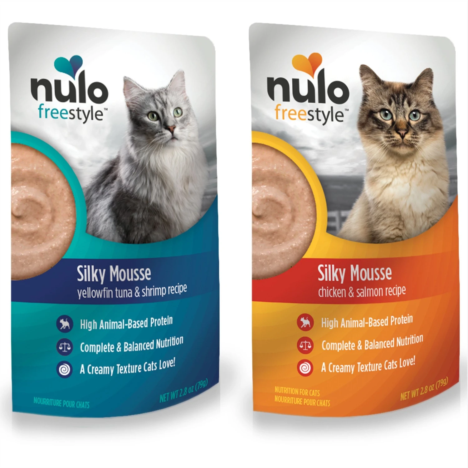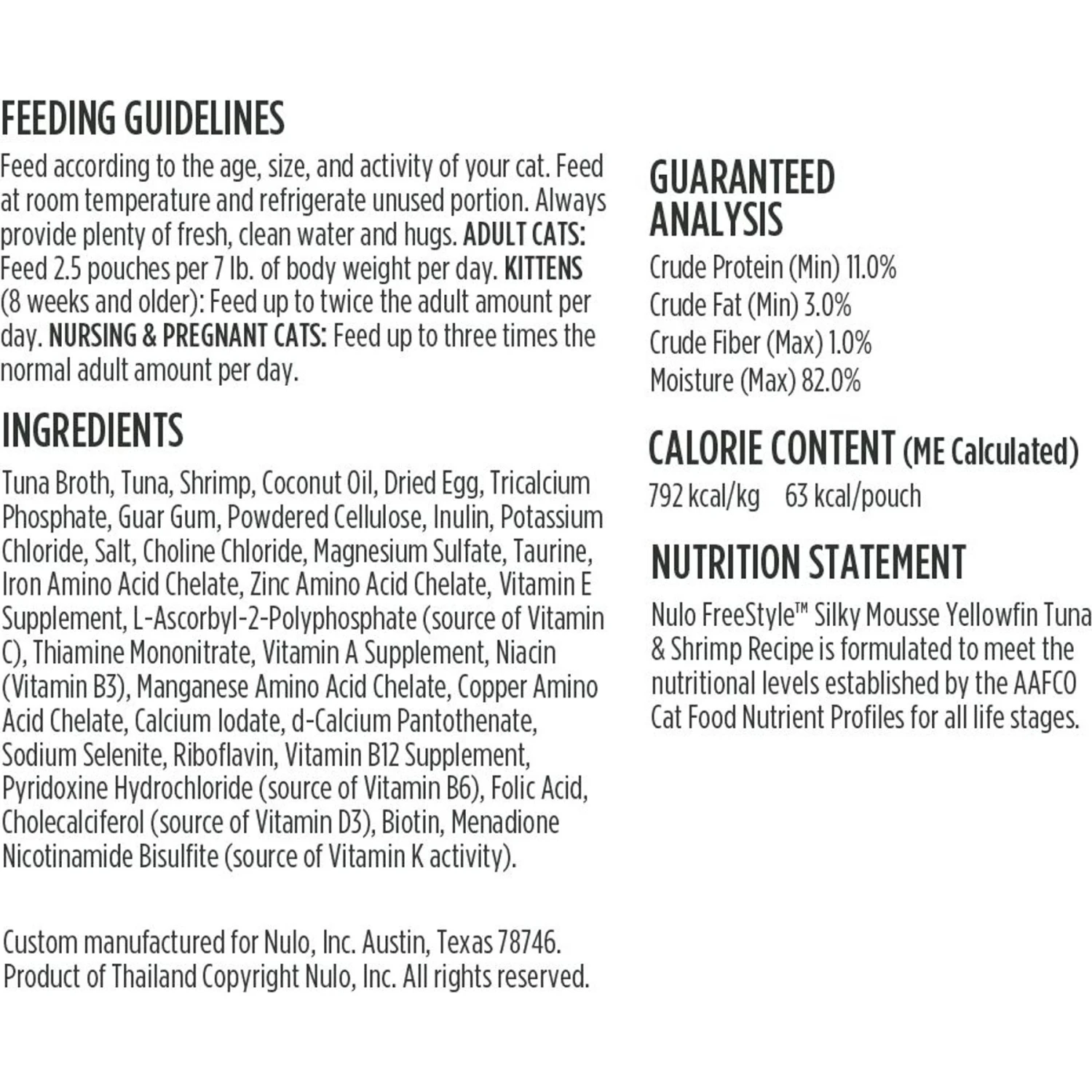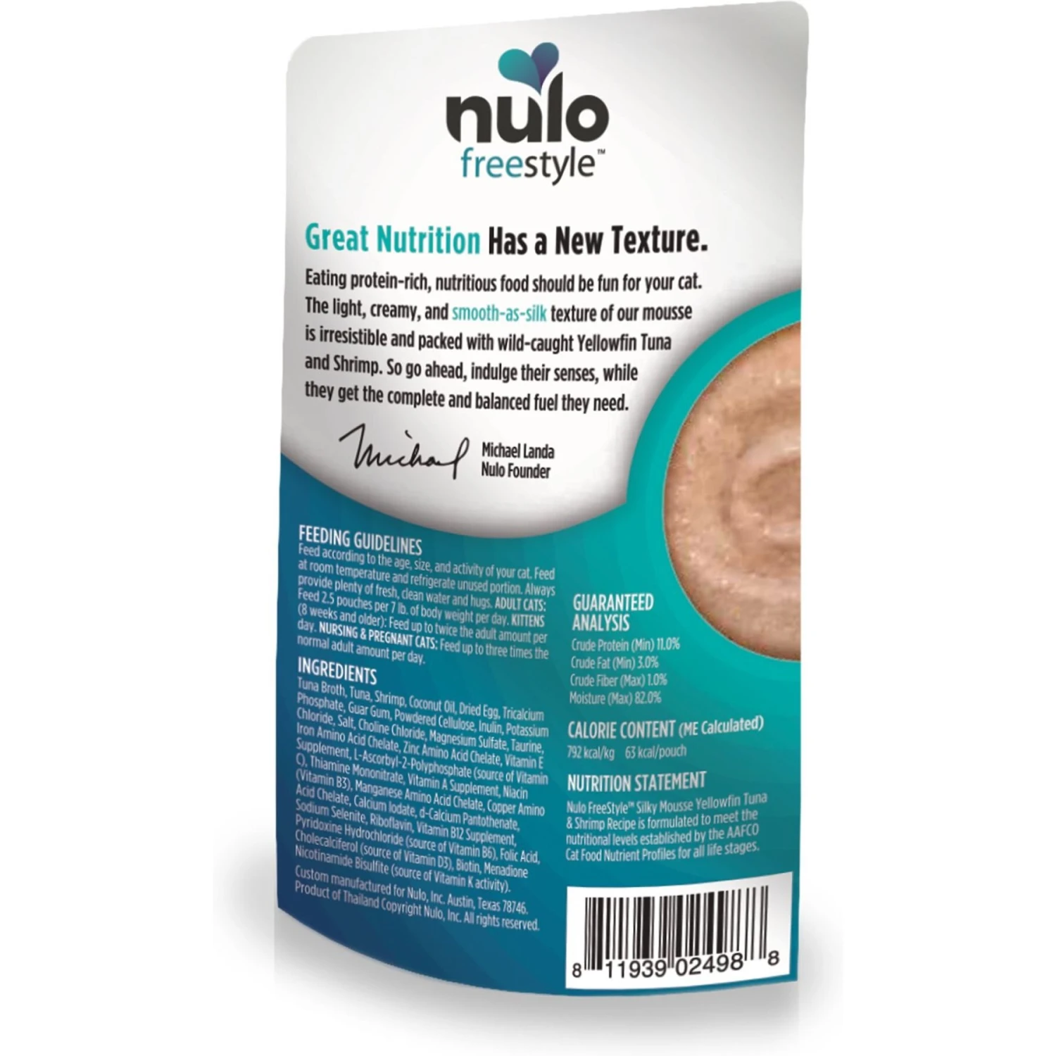 Nulo Freestyle Silky Mousse Tuna & Shrimp Recipe Grain-Free Wet Cat Food, 2.8-oz, case of 24—Help keep your furry family member strong and active by serving him protein-packed Nulo Freestyle Silky Mousse Tuna & Shrimp Recipe! This wet food is loaded up with animal-based protein and other beneficial nutrients like vitamin E and amino acids. It delivers balanced and complete nutrition, as well as phenomenal fishy flavor. Best of all, your kitty companion will have no trouble scarfing down this nourishing meal, thanks to its’ enticing creamy texture. This Nulo recipe is sure to leave your cat purring in appreciation!
