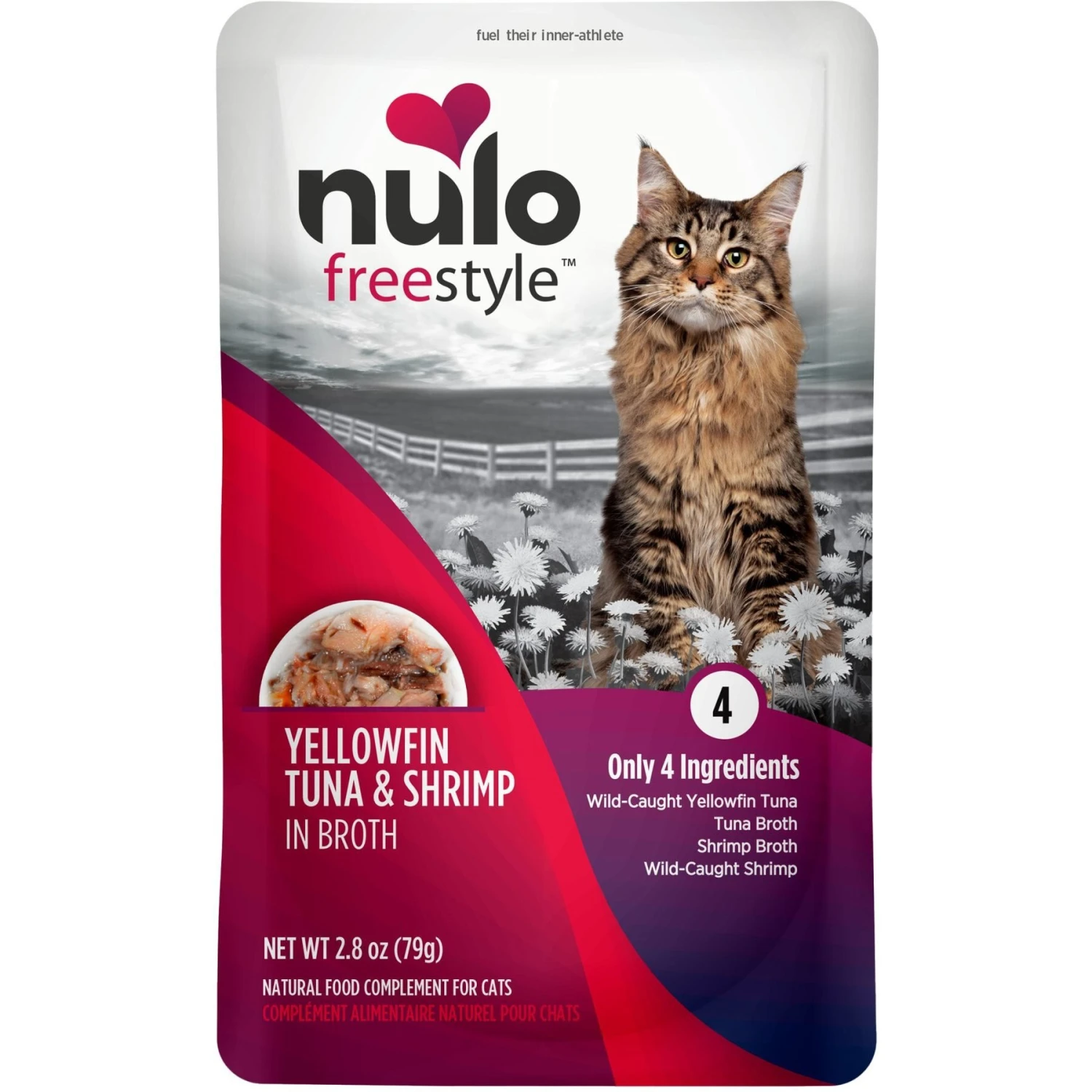 Give your feline friend a delectable dinner straight from the sea when you add Nulo’s FreeStyle Yellowfin Tuna & Shrimp in Broth Cat Food Topper to her kibble! Packed with real wild-caught yellowfin tuna and shrimp in their broth, this nourishing meal enhancer is made without any artificial flavors or preservatives. It’s rich in healthy protein to help support lean muscle and the added moisture provides your pet with extra hydration. Completely free of fillers, grains or binders, it’s a wholesome treat that will have your kitty running to her food dish! Serve it on top of kibble for extra flavor and nutrients or as a low-fat snack to add protein to your cat’s diet.
