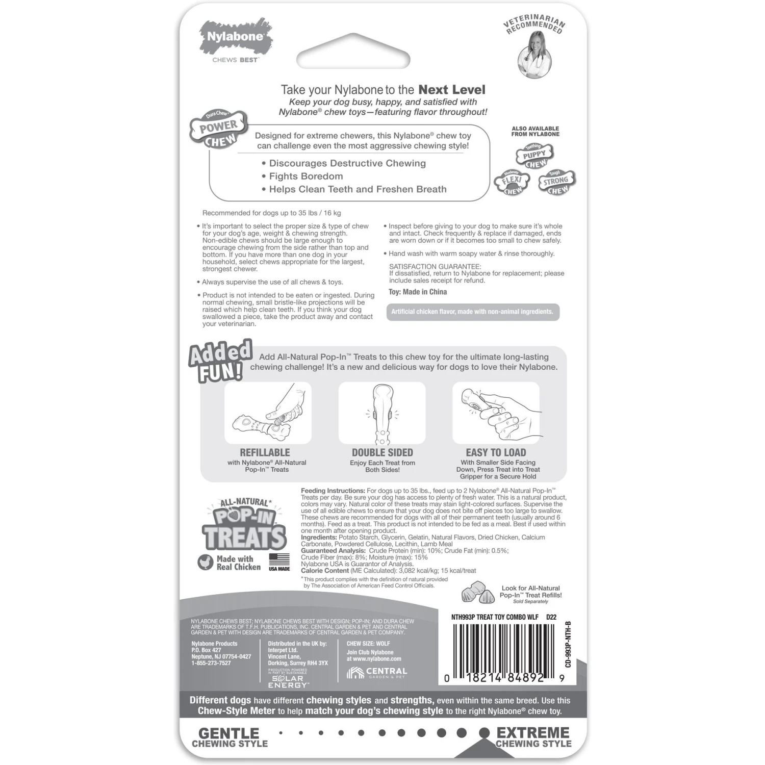 Give your dog the ultimate chewing challenge with the Nylabone Power Chew Knuckle Bone & Pop-In Treat Toy Combo. Made of sturdy nylon, this long-lasting combo toy stands up to the most aggressive chewers and takes chew time to the next level. Add the included All-Natural Pop-In Treats to the refillable Knuckle Bone dog toy for deliciously long-lasting treat and chew time fun. The easy-to-load chicken dog treats fit securely within the chew toy and allow your dog to enjoy the treat from both sides. Small in size and big in flavor, the highly digestible treats contain limited ingredients and are proudly made in the USA. To add to the enjoyment, the knuckle bone toy features delicious chicken flavor throughout, satisfying your dog’s natural urge to chew and his love of meaty taste. Special nubs and ridges on the toy help clean teeth and freshen breath through chewing action, too. Whether you want to challenge your furry friend or simply reward him for being a good dog, this treat and chew toy combo is the right way to do it!