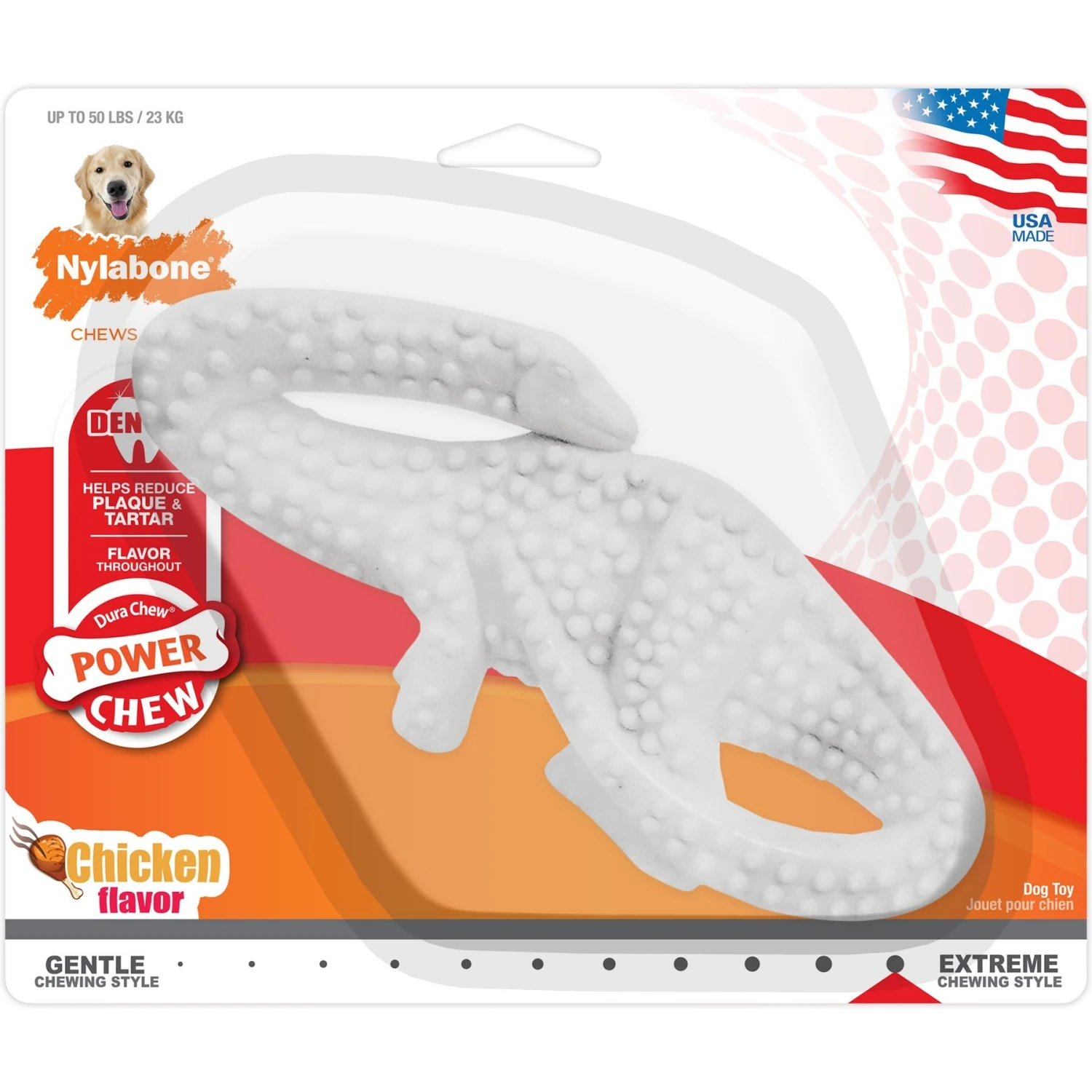 Powerful chewers need powerful chew toys! Nylabone’s Power Chew Dental Dinosaur Dog Toy helps satisfy your dog’s prehistoric urge to chew with an irresistible chicken flavor throughout. This dental chew toy features gently rounded nubs and bristles that raise during chewing. They promote clean teeth, help control plaque and tartar buildup, massage gums, and freshen breath as your dog chews. Made of tough, durable nylon, this long-lasting chew stands up to even the most aggressive chewers. Your dog will stay occupied for hours, discouraging destructive chewing. Reward your dog with this din-o-mite chew toy!