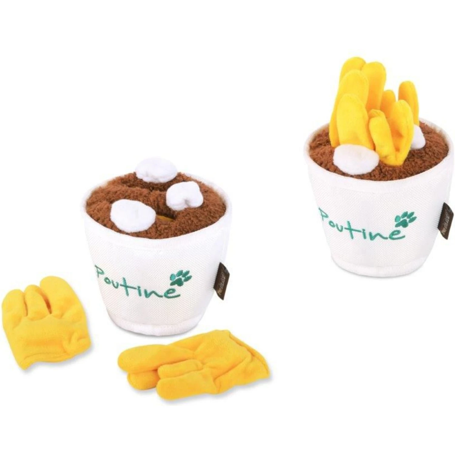 Take your pup on a fun food tour with the P.L.A.Y. X Earth Rated Poutine Plush Squeaky Dog Toy! This Montreal Munchies plush toy for dogs is inspired by the best in Canadian cuisine. Each cup is stuffed with a fluffy faux gravy, cheese and two squeaker-filled, removable batches of French fries! More than a savory snack, this find-and-seek toy is paw-fect for hiding your dog’s favorite treats inside (sold separately). Plus, it’s machine washer and dryer friendly!