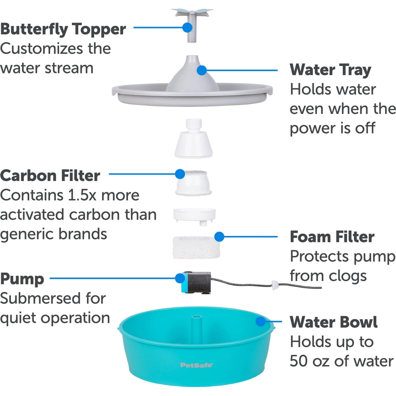 - The beautiful butterfly topper creates free-falling streams, and it can be removed to create a quiet bubbling flow to give your pet plenty of drinking options.
