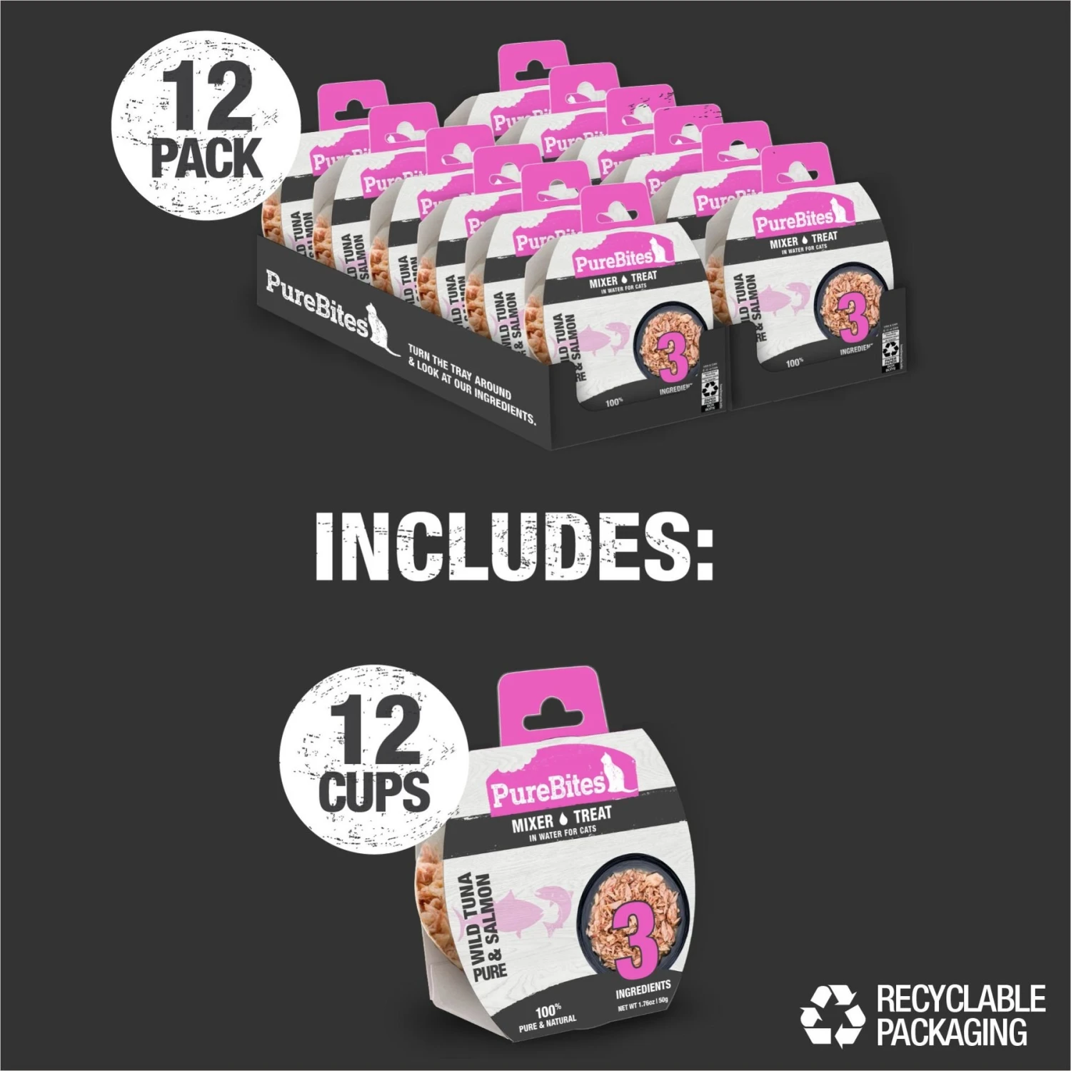 Made with just two ingredients, PureBites Mixers 100% Tuna & Salmon in Water Grain-Free Cat Food Trays are tasty, nutritious and fresh. Pure wild skipjack tuna and wild Alaskan salmon are high in protein, and added water helps to keep your furbaby hydrated. You can feed this versatile food in many ways – feed it as a treat, an appetizer, a mixer or a topper to make dry food more appealing to picky kitties. Each tray is just 32 calories, purr-fect for cats who need to lose a little weight. This grain-free food is also ideal for kitties who are diabetic, have allergies, have gastrointestinal disorders or are on a restricted diet.
