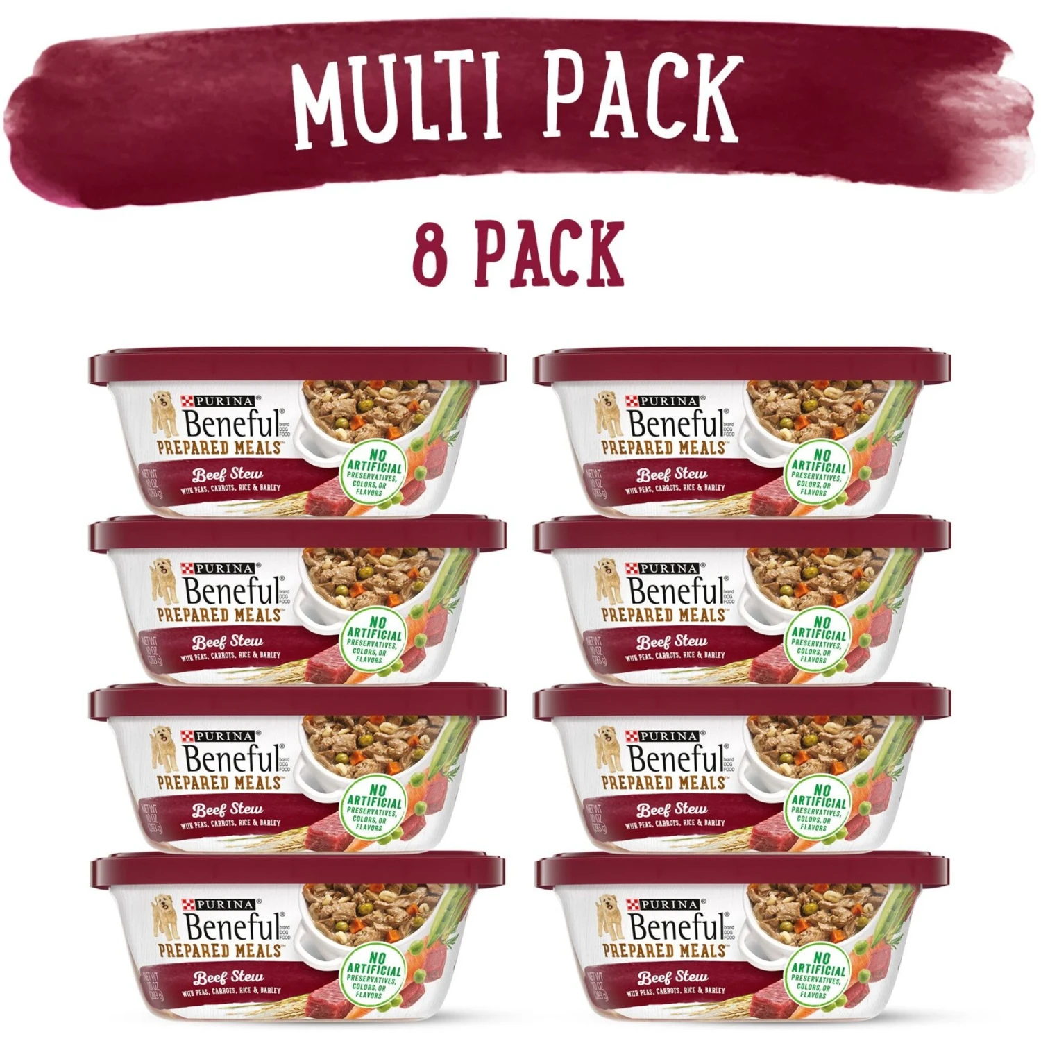 Beef up your pooch’s menu with the tender, meaty chunks in Purina Beneful Prepared Meals Beef Stew Wet Dog Food. This hearty stew is made with real beef—a high-quality source of protein that helps support strong muscles for a life filled with adventure. The yummy high-protein dog food is also made with other wholesome ingredients like rice, barley and real veggies you can see, including peas and carrots. For the finishing touch, a savory dog food gravy amps up the flavor. Your furry pal gets 100 percent complete and balanced nutrition for adult dogs, including 23 essential vitamins and minerals that support his nose-to-tail well-being. Serve this Purina Beneful wet dog food alone as a yummy meal, or mix some in with his favorite kibble to create delicious combos of texture and flavor. Each premium dog food tub is recloseable to easily store leftovers.