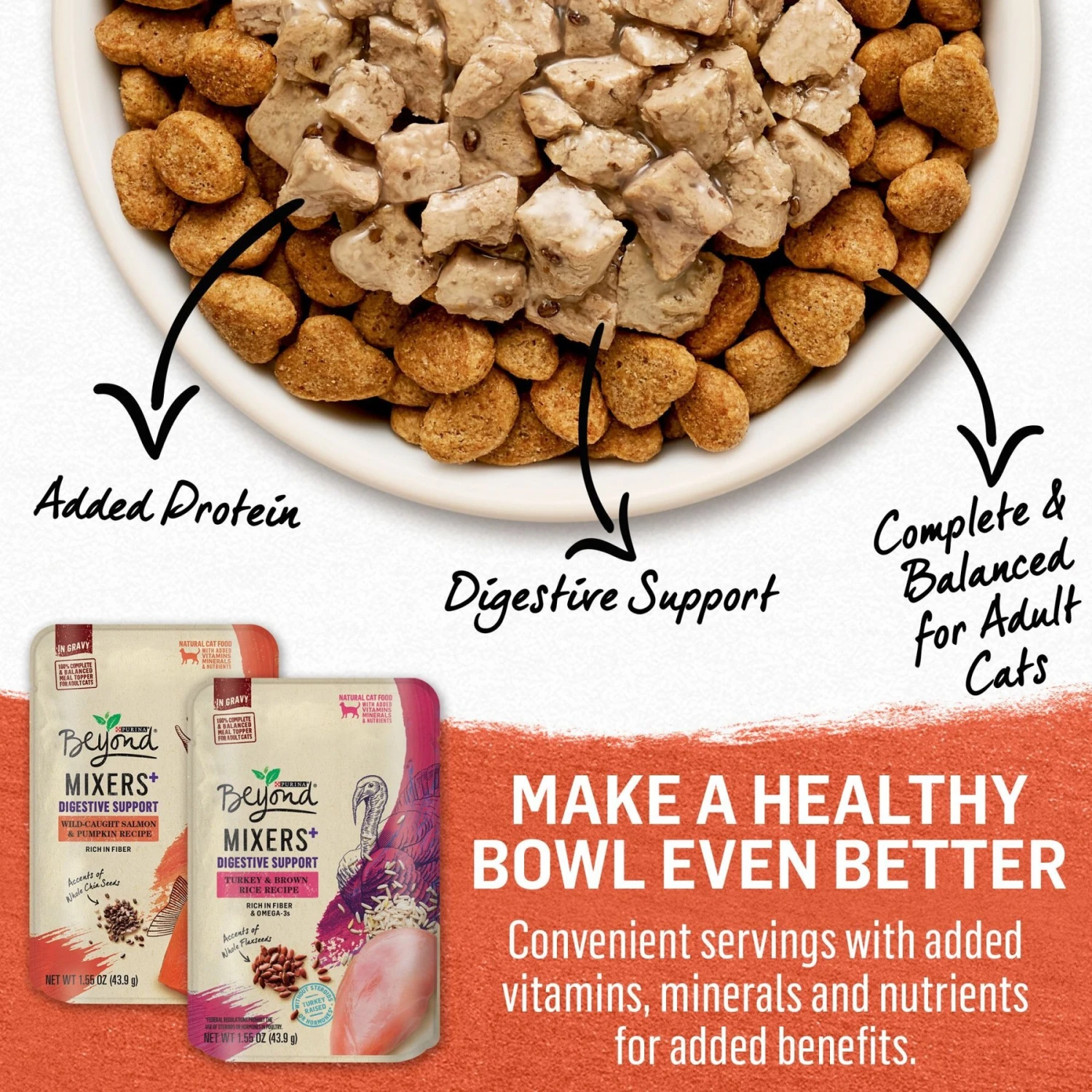 Mix and match your kitty’s meals with a Purina Beyond Mixers+ Digestive Support Wet Cat Food Complement Variety Pack to boost her healthy digestion. She gets tender chunks made with real salmon or real turkey prepared in a savory gravy, plus loads of fiber for digestive health. Two recipes—Turkey & Brown Rice and Wild-Caught Salmon & Pumpkin—bring variety and fun to her dish. For more goodness, accents of whole flaxseed or pumpkin are blended in. Best of all, each easy-open pouch of these natural cat food mixers has added vitamins, minerals and nutrients. With 100% complete and balanced nutrition for adult kitties, both cat food toppers give you the freedom to customize her bowl your way. Plus, no corn, soy or animal by-product meal are added, meeting your high standards for your BFF. Variety is the spice of life. Create a personalized menu as unique as your feline friend with these digestive cat food complements.