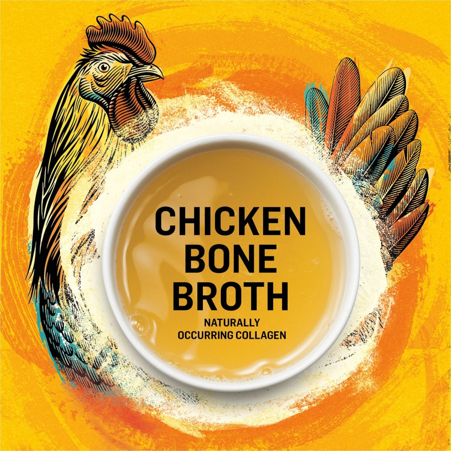 - Features real chicken bone broth first, plus naturally occurring collagen.