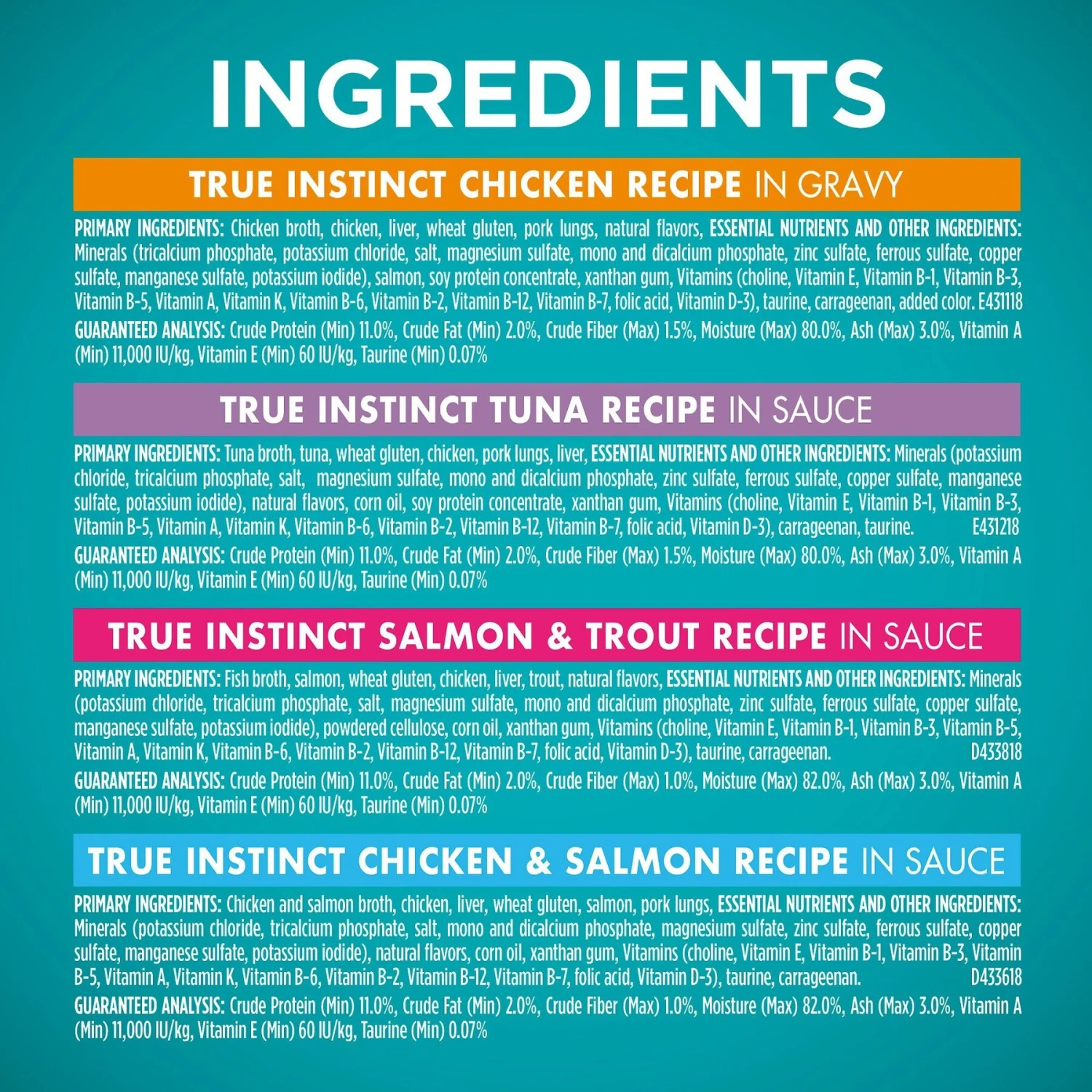 Satisfy your favorite feline’s instinctive need for real meat with Purina ONE True Instinct 4 Flavors Variety Pack Canned Cat Food. These nutrient-dense, mouth-watering formulas start with real meat as the top ingredient for a high-protein diet that’s great for cats of all ages. It’s enhanced with vitamins, minerals and antioxidants, including taurine, to cover all the bases for overall health and a healthy immune system. The savory sauce makes for an irresistible meal that also provides essential moisture to keep your kitty healthy and hydrated.