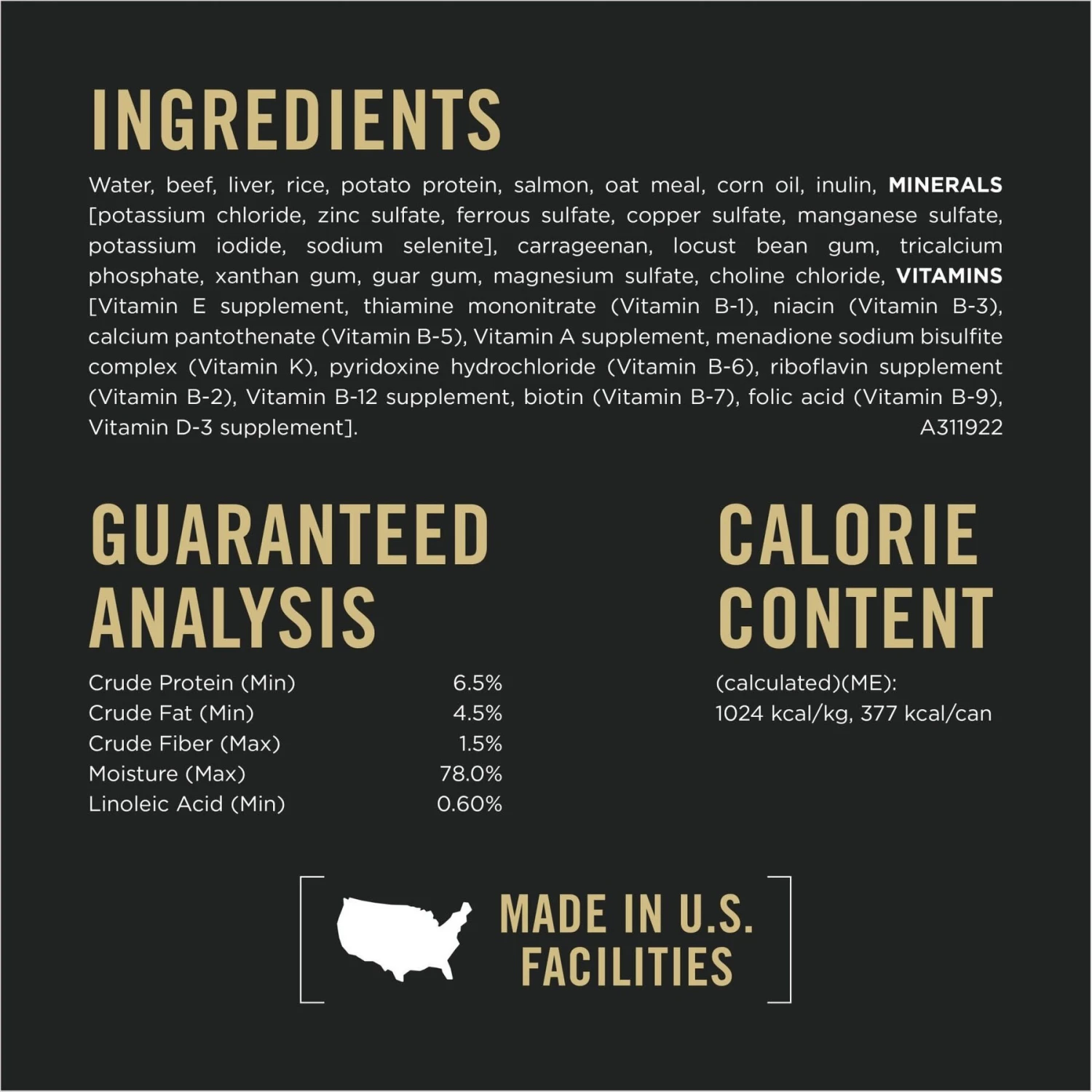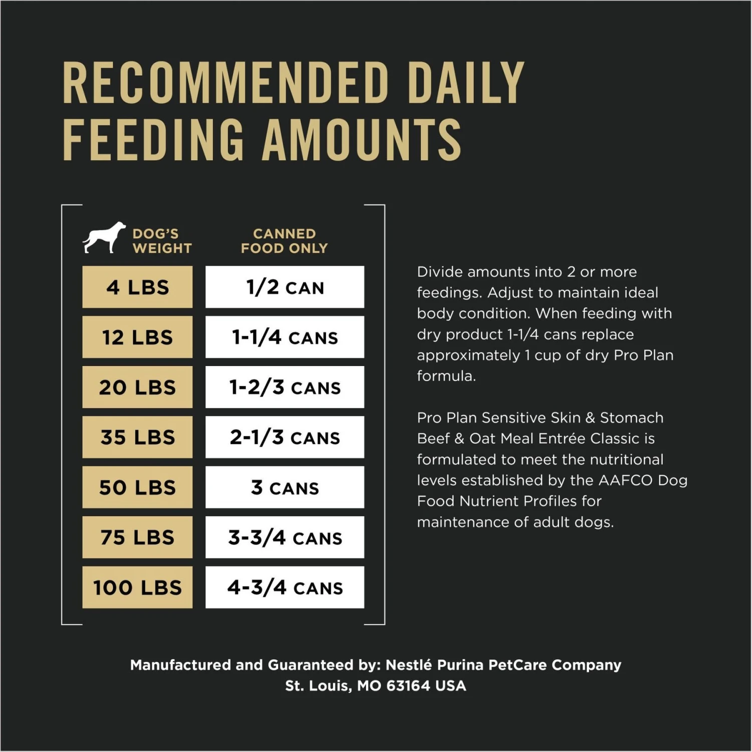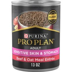 Improve your canine companion’s skin and coat health with Purina Pro Plan Adult Sensitive Skin & Stomach Beef & Oat Meal Entree Wet Dog Food. This nutrient-rich, high protein dog food provides 100% complete and balanced nutrition for your adult dog. It includes real beef, easily digestible oat meal and natural prebiotic fiber for pups with sensitive stomachs. Plus, it has linoleic acid to nourish your pal’s skin and coat health and 23 essential vitamins and minerals to support his overall health. This wet dog food is made with no artificial colors, flavors or preservatives—only the good stuff your pup needs to look and feel his best.