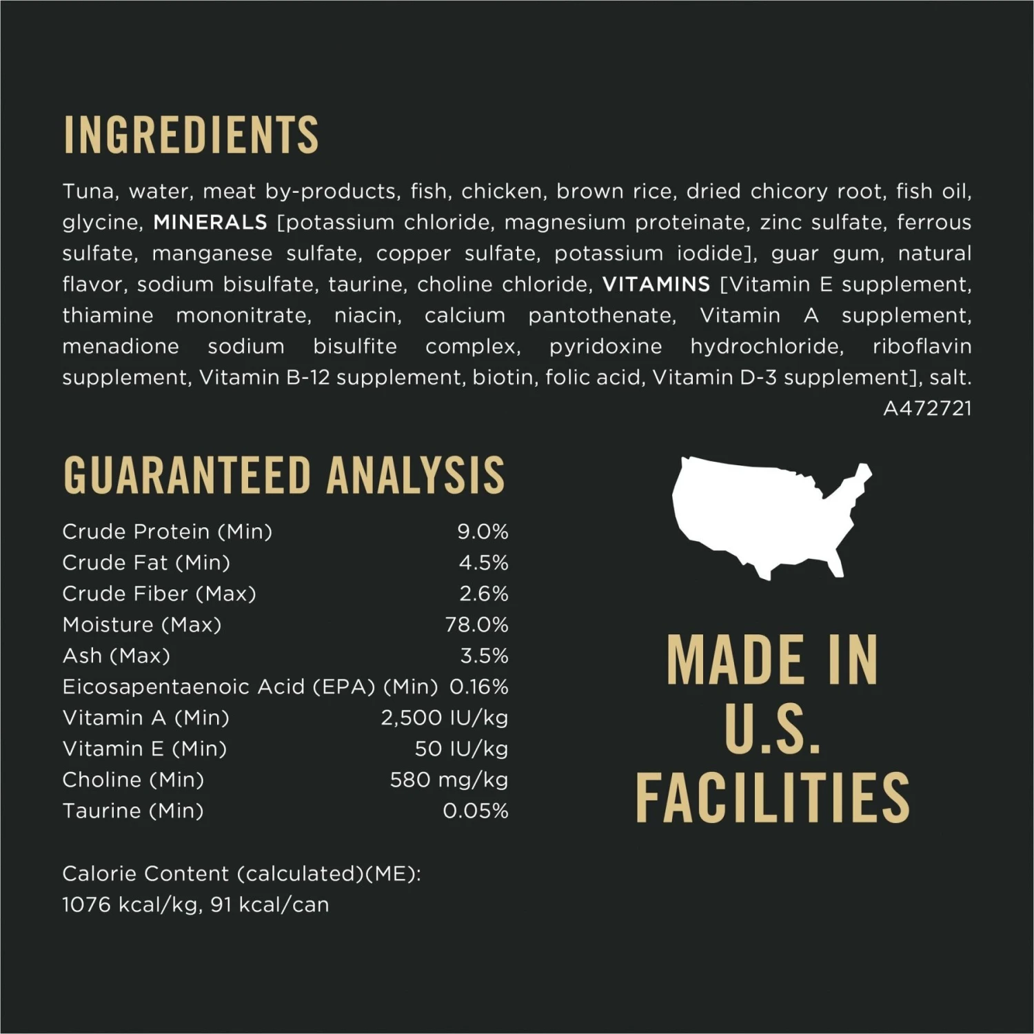 Delight your cat with a mouthwatering 4-in-1 premium cat food entree that supports immune, digestive, kidney and brain health with Purina Pro Plan’s Vital Systems 4-in-1 Support Tuna Entrée Pate Wet Cat Food. This complete and balanced high-protein cat food recipe features a thoughtful blend, crafted in partnership with expert chefs and nutritionists, featuring tuna as the #1 ingredient. Sure to become a mealtime favorite for your cat, this tuna cat food pate formula features a plethora of healthy ingredients to support your cat’s vital systems. These ingredients include prebiotic fiber for cat digestive health, omega-3 fatty acids for kidney support, choline for brain health and a powerful antioxidant blend for the immune system. This Purina Pro Plan cat food is proudly manufactured and tested for quality and safety in Purina-owned U.S. facilities.