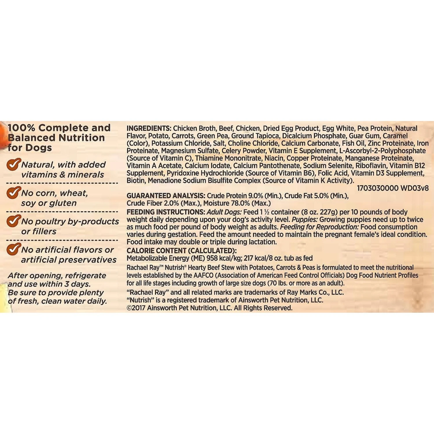 Treat your pup to a hearty, wholesome and yummy meal with Rachael Ray Nutrish Natural Hearty Beef Stew Natural Grain-Free + Beef Stroganwoof Natural Wet Dog Food. These irresistible recipes are crafted with real meat and vegetable accents your dog can’t wait to devour. The Hearty Beef Stew is made with scrumptious chunks of beef plus garden vegetables like peas, carrots and potatoes, all simmered in a yummy homestyle beef gravy. Meanwhile, the Beef Stroganwoof is made with tasty, tender beef morsels plus wholesome green beans, tomatoes and pasta simmered in beef gravy. And best of all, they’re only made with simple, easy-to-digest ingredients—no gluten, corn, wheat, soy, meat by-products, fillers or artificial flavors, colors or preservatives.
