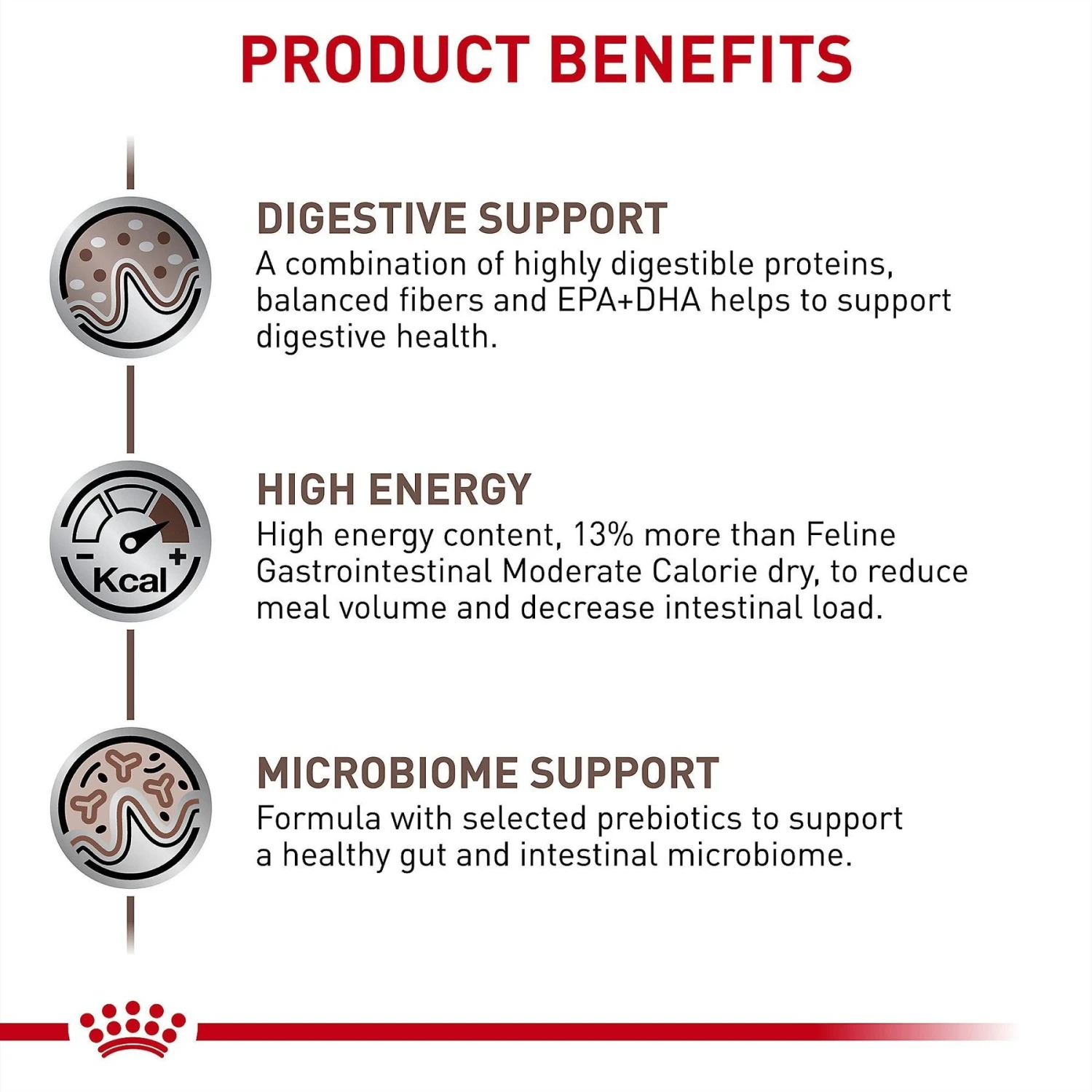 Royal Canin Veterinary Diet Gastrointestinal Dry Cat Food is a highly palatable and high-energy diet for cats with digestive sensitivities. It is also formulated with highly digestible proteins, enhanced omega-3 fatty acids like EPA and DHA, and a fiber blend to support digestive health. The fiber blend includes highly fermentable prebiotic fibers to help support the microbiome and less-fermentable fibers to support stool quality and regularity. The high energy content supports underweight cats or cats with a reduced appetite. Plus, the exclusive S/O index supports urinary health by creating an environment unfavorable to crystal formation in the bladder. Interested in a wet food complement? Ask your veterinarian about pairing this diet with Royal Canin Gastrointestinal Wet Cat Food (sold separately).