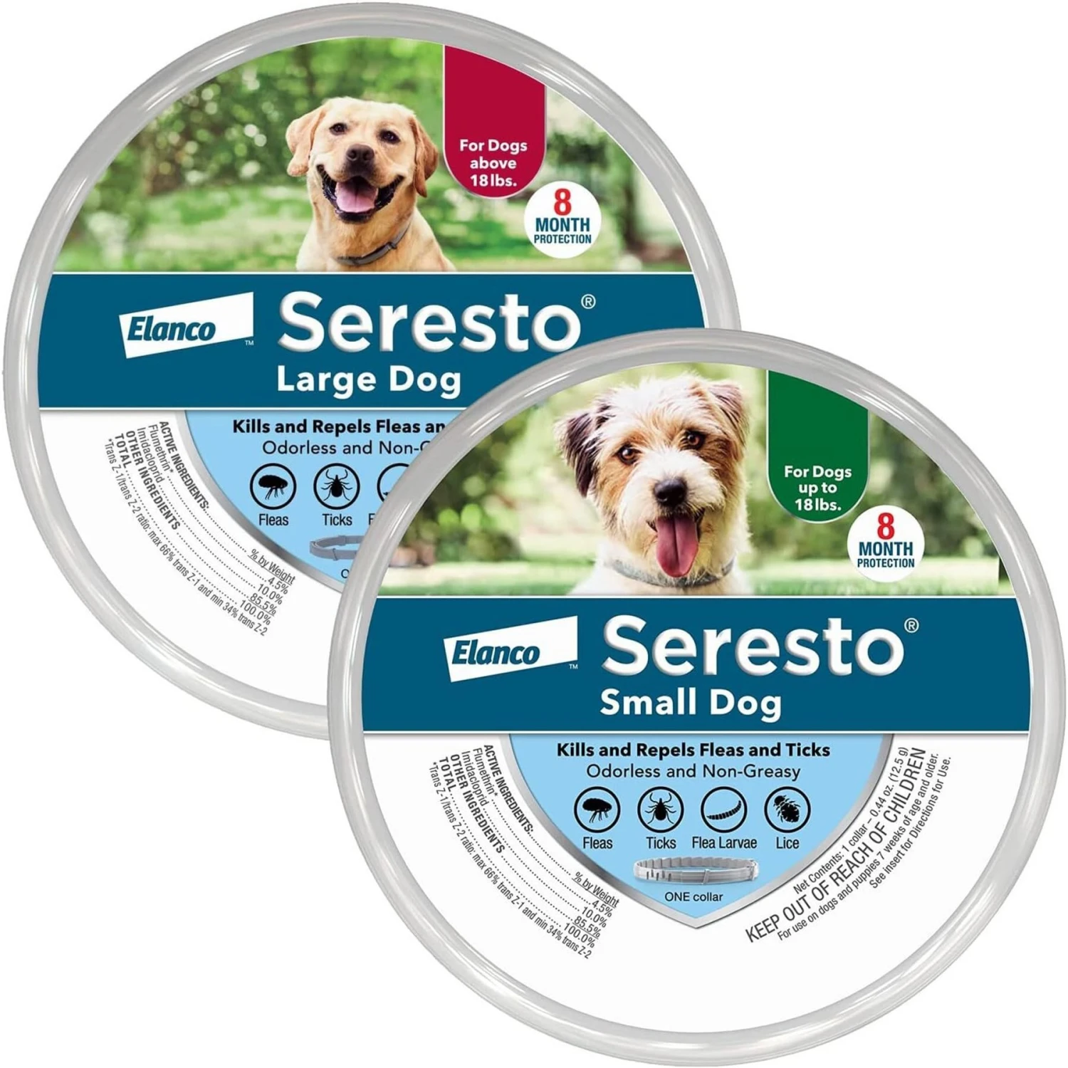 Help protect your canine companions with this Seresto bundle! Every purchase comes with the Seresto Flea & Tick Collar for Dogs, over 18 lbs and the Flea & Tick Collar for Dogs, up to 18 lbs. With its innovative delivery system, the Seresto 8 Month Flea & Tick Collar offers a breakthrough in tick and flea control for your precious pup. This veterinarian-recommended treatment is specifically formulated to repel and kill fleas and ticks on contact with no painful biting required. Inside the unique polymer matrix of these easy-to-use, non-greasy, odorless collars are two active ingredients: imidacloprid to control flea infestations, and flumethrin to repel and kill ticks, larvae and nymphs. These ingredients work together to provide dual-action protection against parasitic pests for up to eight months!