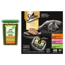 Take care of your kitty companion. Each purchase comes with Sheba Perfect Portions Grain-Free Multipack Roasted Chicken, Gourmet Salmon & Tender Turkey Cuts in Gravy Cat Food Trays, 2.6-oz, case of 24 twin-packs & Greenies Feline Smartbites Hairball Control Chicken Flavored Cat Treats, 16-oz tub. Sheba Perfect Portions Roasted Chicken, Gourmet Salmon and Tender Turkey Cuts in Gravy Entrées keeps your kitty’s meal routine lively. This variety pack includes 12 Roasted Chicken, 6 Gourmet Salmon and 6 Tender Turkey Cuts in Gravy Twin Pack Entrees and delivers enough meal excitement to satisfy even the finickiest felines. All entrees feature tender meaty morsels in tasty gravy and contain all the essential vitamins and minerals your cat needs to feel her best. They’re made entirely without grain, wheat, corn, soy or artificial flavors and preservatives and come in convenient snap-and-peel twin packs that let you feed just the right amount without leftovers every time. Your best friend will love getting a new flavor every day and you’ll love the mess-free convenience! Greenies Feline Smartbites Hairball Control Chicken Flavored Cat Treats help reduce discomfort in your furry friend. These treats help minimize hairball formation while supporting healthy digestion in your paw-tner. They are made with natural ingredients, plus vitamins, minerals, and other nutrients for a complete and balanced snack. These treats also feature a mix of crunchy and creamy textures with a delectable chicken flavor. With less than two calories per treat, Greenies Feline Smartbites Hairball Control Chicken Flavored Cat Treats are ideal as a reward for your companion.