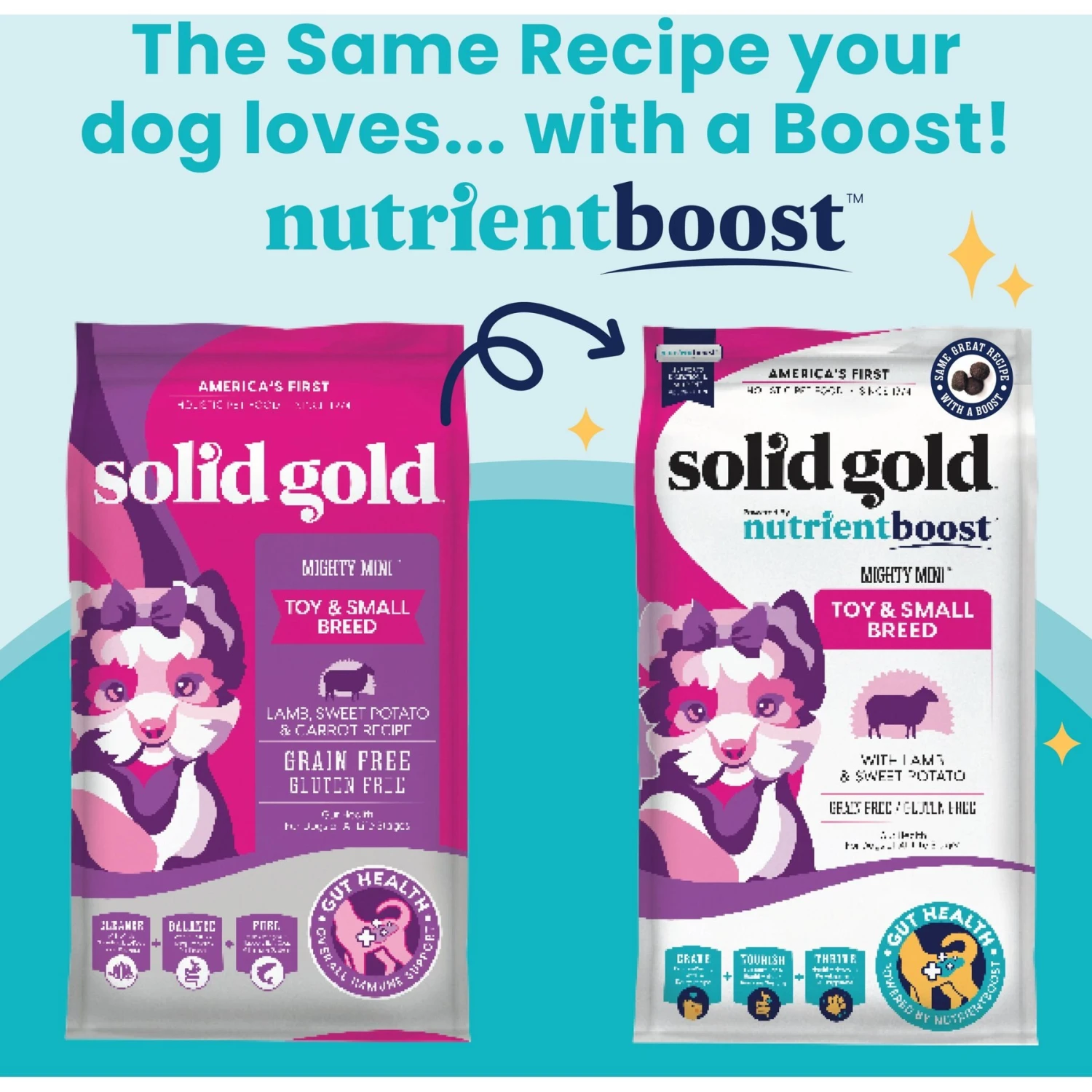 The Solid Gold Nutrientboost Mighty Mini Small & Toy Breed Dry Dog Food is full of big nutrition for your small breed furbaby. Paw-fectly balanced for your pup’s mini size, this grain- and gluten-free formula is ideal for puppies, adults and seniors. It’s full of tasty lamb, sweet potatoes and carrots for easily digestible protein. These nutrient-dense superfoods and omega fatty acids promote gut health, skin and coat health and immune support to help keep your best friend looking and feeling paw-some. The kibble is designed for small mouths to help your furbaby chew, and is also ideal for dogs with sensitive stomachs.