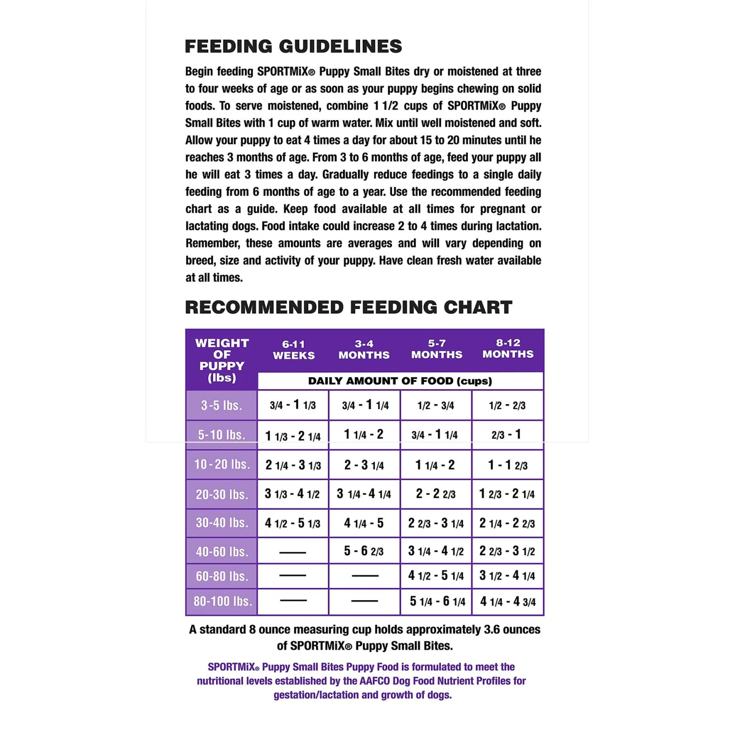 SPORTMiX Premium Small Bites Puppy Dry Dog Food is formulated to meet your puppy’s needs during his first full year of growth. This nutrient-rich formula contains protein from chicken and fish combined with a high level of vitamins and minerals to promote the development of bones, teeth and muscles during this rapid stage of growth. Balanced Omega-6 and Omega-3 fatty acids support healthy skin and a beautiful coat, so your puppy stays healthy from the inside out. SPORTMiX Small Bites Puppy Food is 100% complete and balanced nutrition with a taste that puppies love.