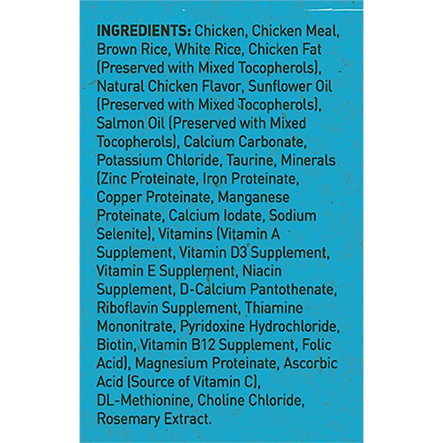 - Cage-free chicken, rice, cold-pressed sunflower oil, and salmon are the primary ingredients in this food.