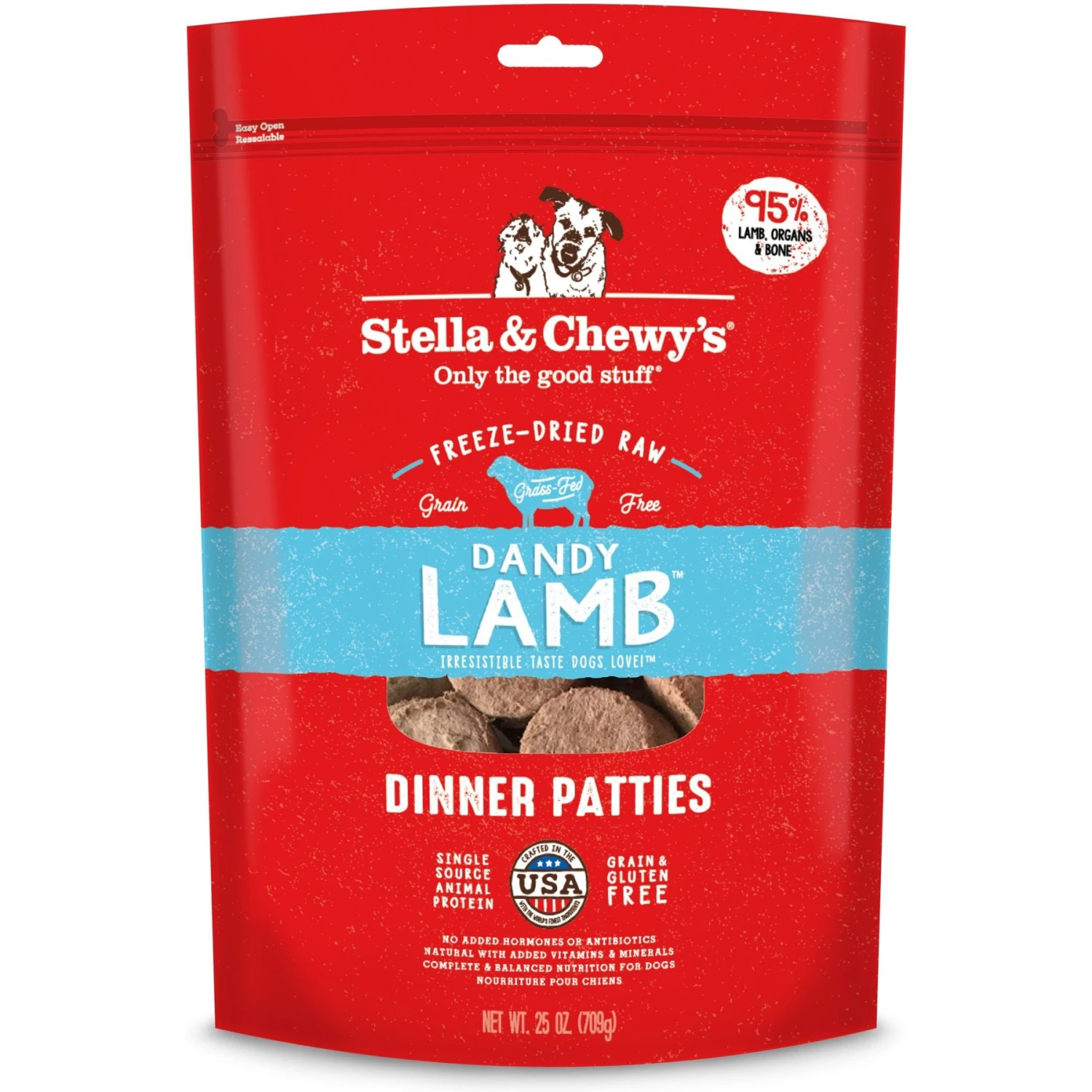 Give your dog what he naturally craves with Stella & Chewy’s Dandy Lamb Dinner Patties Freeze-Dried Raw Dog Food. Based on the philosophy that dogs thrive on the same diet they would eat in the wild, this all-natural recipe makes it easy to feed your best friend only the good stuff. Made from sustainably-sourced ingredients and raw, single-source protein, this recipe starts with 95% grass-fed lamb, organs and bone, plus 100% certified organic fruits and vegetables—offering the benefits of raw food nutrition with the convenience of freeze-dried preparation. And to ensure the highest quality, each batch is made with care in Stella & Chewy’s own U.S. kitchen.