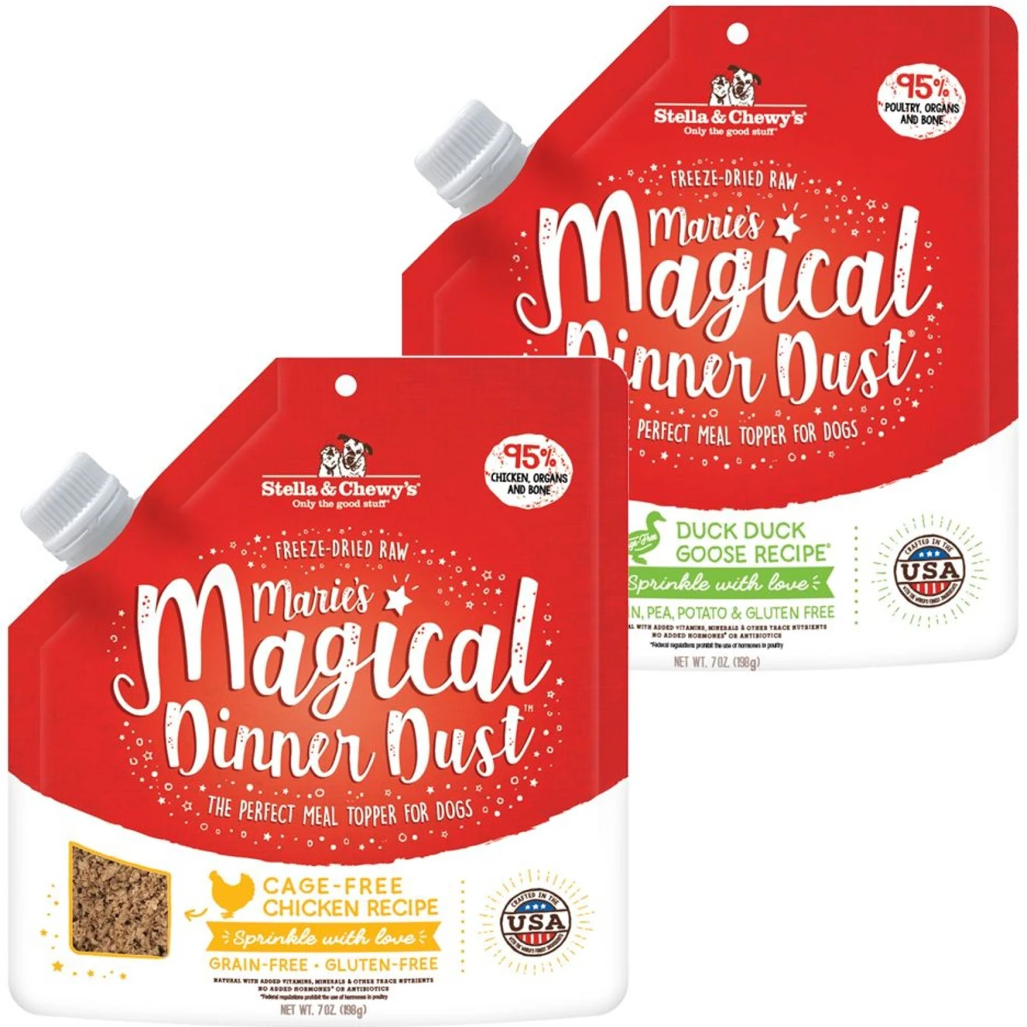 Stella & Chewy’s Marie’s Magical Dinner Dust Freeze-Dried Raw Cage-Free Chicken Dog Food Topper, 7-oz bag—Give your paw-tner a boost of raw nutrition with Stella & Chewy’s Marie’s Magical Dinner Dust Cage-Free Chicken Dog Food Topper. This grain-free, gluten-free and freeze-dried recipe is crafted in the USA with 95% raw, cage-free chicken, organs and bone, plus organic fruits and vegetables like cranberries, spinach, broccoli, beets, carrots, blueberries and more! Simply sprinkle the topper on your canine companion’s favorite nutritionally balanced and complete meal for an extra helping of vitamins, minerals and other trace nutrients. Your furry friend will love the taste and you’ll love knowing that there are no added hormones, antibiotics or binders in this delicious Dinner Dust!