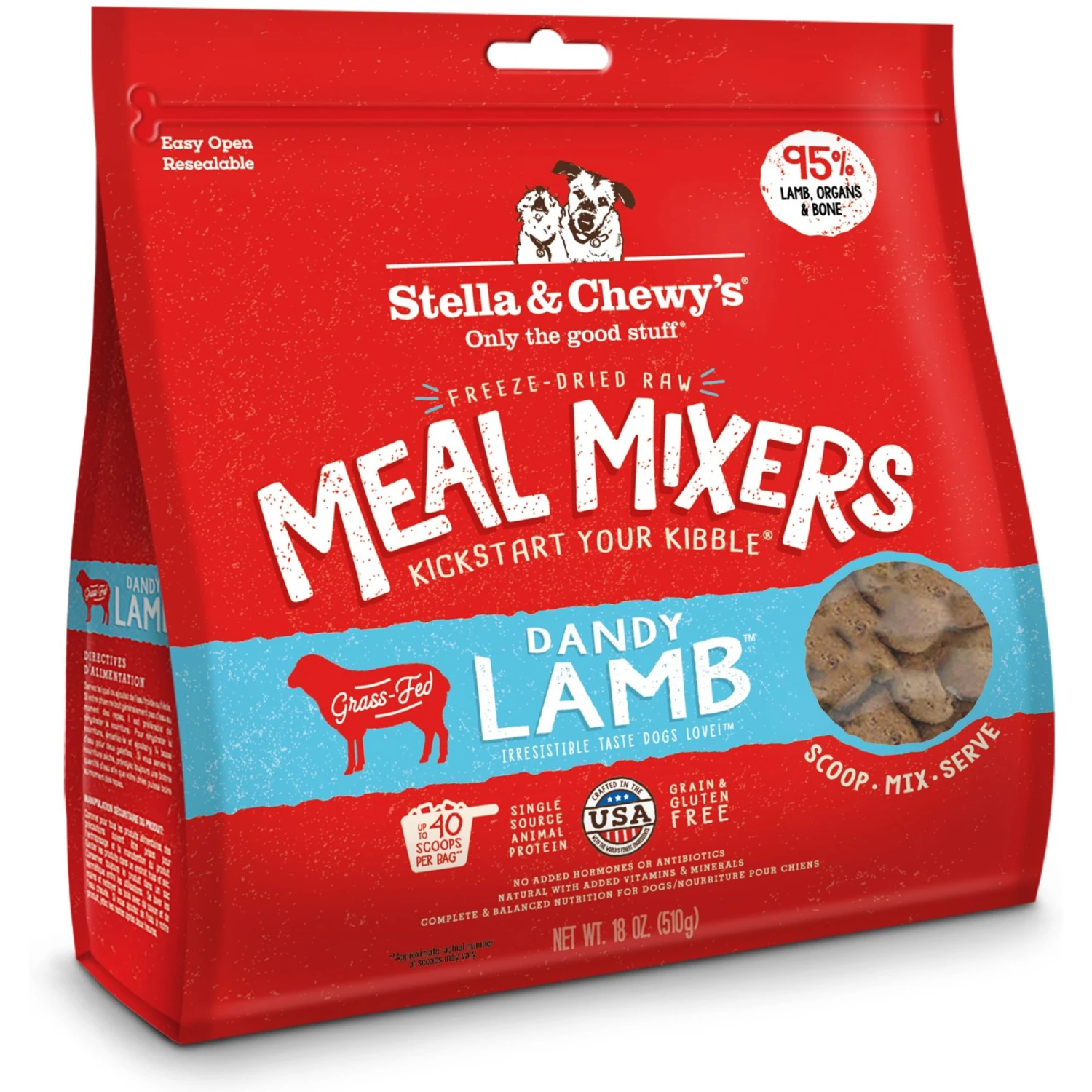 Stella & Chewy’s Dandy Lamb Meal Mixers Freeze-Dried Raw Dog Food Topper, 18-oz bag—Kickstart your canine’s kibble with Stella & Chewy’s Dandy Lamb Meal Mixers Freeze-Dried Raw Dog Food Topper. Delivering a boost of nutrition and yummy flavor, it’s an easy way to pack your pooch’s diet with nutrients, probiotics and antioxidants. Based on the philosophy that pets thrive on the same diet they would eat in the wild, this recipe gives your dog what he naturally craves, and is made from 95% grass-fed lamb, organs and bone plus 100% organic fruits and vegetables—offering the benefits of raw food nutrition with the convenience of freeze-dried preparation. And to ensure the highest quality, each batch is made with care in Stella & Chewy’s own U.S. kitchen.