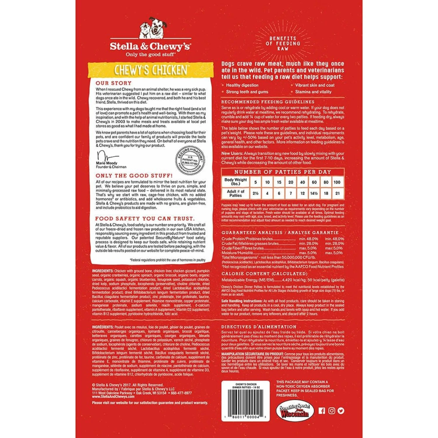 Stella & Chewy’s Chewy’s Chicken Dinner Patties Freeze-Dried Raw Dog Food, 14-oz bag—Give your dog what he naturally craves with Stella & Chewy’s Chewy’s Chicken Dinner Patties Freeze-Dried Raw Dog Food. Based on the philosophy that dogs thrive on the same diet they would eat in the wild, this all-natural recipe makes it easy to feed your best friend only the good stuff. Made from sustainably-sourced ingredients and raw, single-source protein, this recipe starts with 95% cage-free chicken, organs and bone, plus 100% certified-organic fruits and vegetables—offering the benefits of raw food nutrition with the convenience of freeze-dried preparation. And to ensure the highest quality, each batch is made with care in Stella & Chewy’s own U.S.-kitchen.