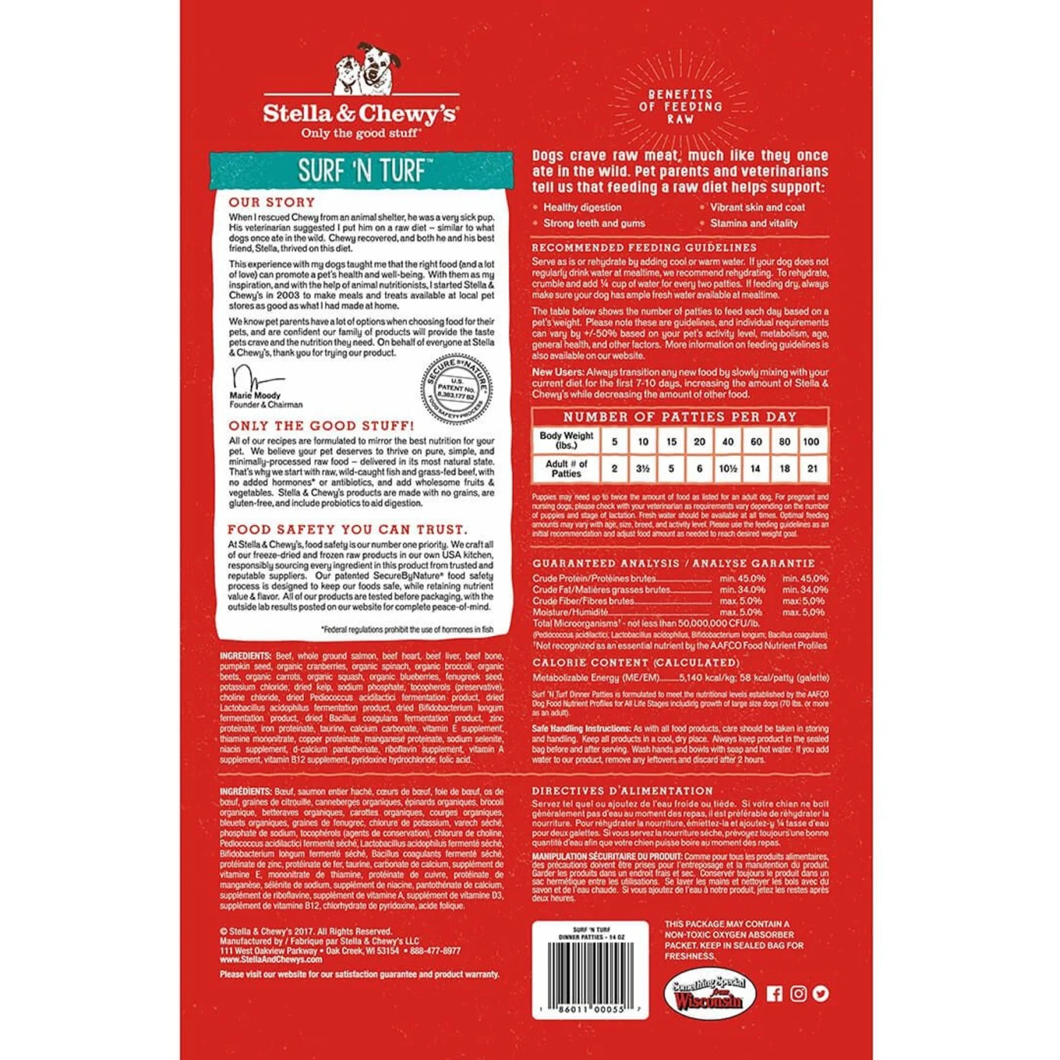 Stella & Chewy’s Surf ‘N Turf Dinner Patties Freeze-Dried Raw Dog Food, 14-oz bag—Give your dog what he naturally craves with Stella & Chewy’s Surf ‘N Turf Dinner Patties Freeze-Dried Raw Dog Food. Based on the philosophy that dogs thrive on the same diet they would eat in the wild, this all-natural recipe makes it easy to feed your best friend only the good stuff. Made from sustainably-sourced ingredients and raw protein, this recipe starts with 95% grass-fed beef, organs and bone, along with wild-caught salmon and 100% certified-organic fruits and vegetables—offering the benefits of raw food nutrition with the convenience of freeze-dried preparation. And to ensure the highest quality, each batch is made with care in Stella & Chewy’s own U.S. kitchen.