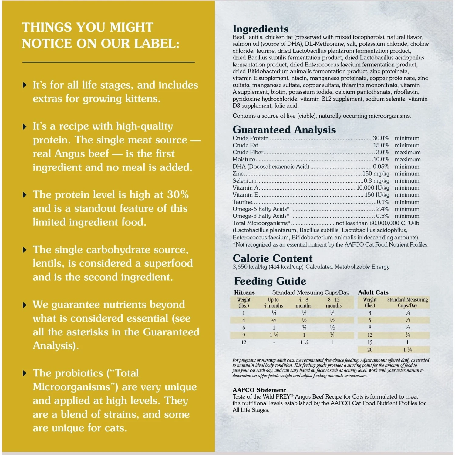 The Taste of the Wild PREY Angus Beef Limited Ingredient Recipe Dry Cat Food 6 lb is a limited ingredient diet that’s su-purr tasty. Angus beef is the first of its three ingredients, followed by yummy lentils and chicken fat. Probiotics support digestion, while vitamins and minerals mean your furbaby gets simple yet complete nutrition. This limited ingredient diet is a paw-some choice for kitties with food sensitivities.